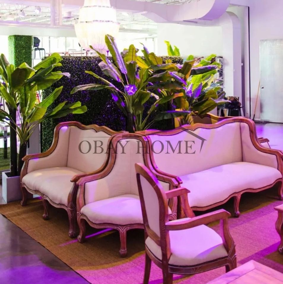 เฟอร์นิเจอร์ปาร์ตี้ให้เช่ากรอบไม้โอ๊คโบราณพร้อมผ้าลินินตกแต่งมุมโซฟาไม้แบบแยกส่วนสำหรับงานปาร์ตี้