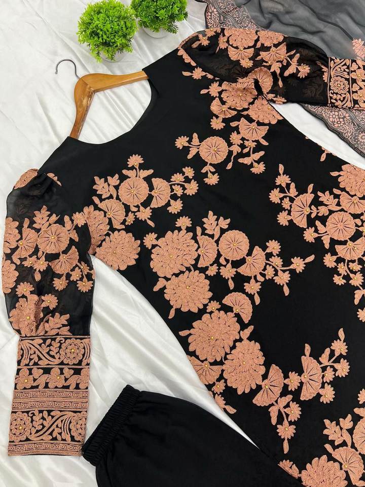 ชุดส่าหรีผ้าจอร์เจตต์ปักลายพิเศษ สีดำสวยงาม โดดเด่น สะดุดตา พร้อมผ้าคลุมไหล่ ให้ลุคสุดฮอตและสง่างาม