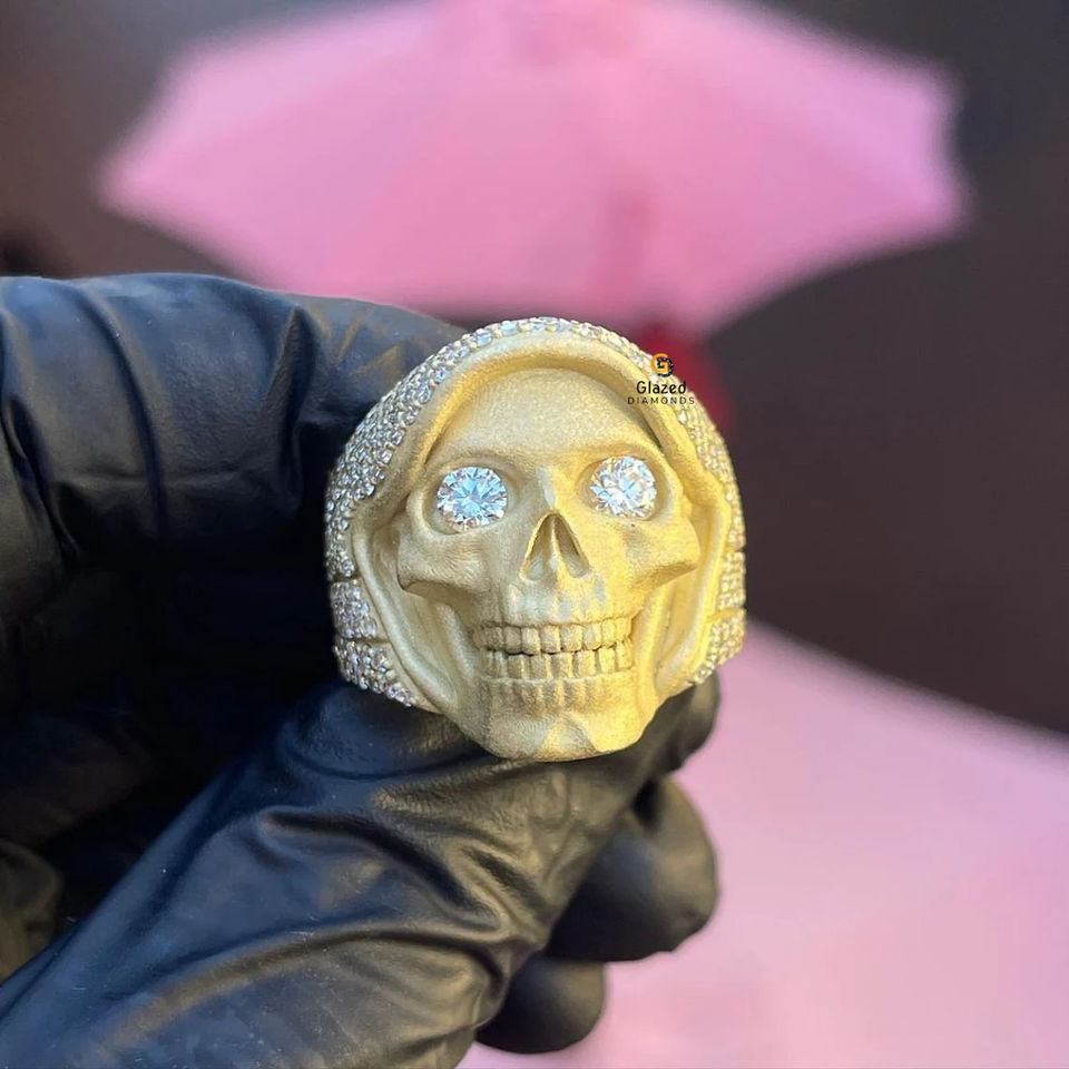 แหวนพิ้งกี้ผู้ชายลายหัวกะโหลก VVS ทรงกะโหลกสีทองแบบตัดเพชรโมอิส Yello9w ทึบ10K