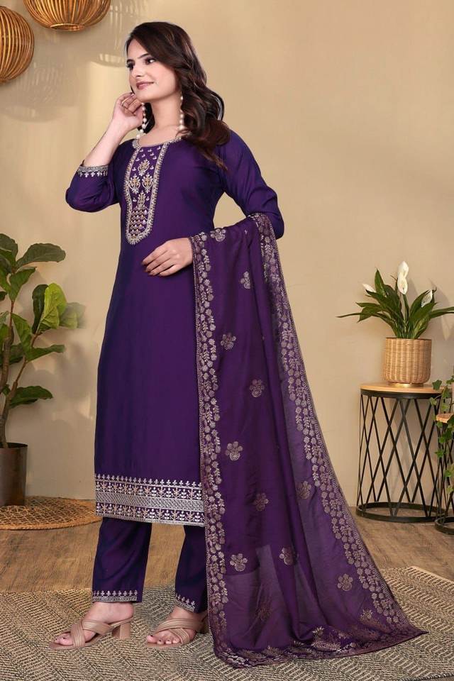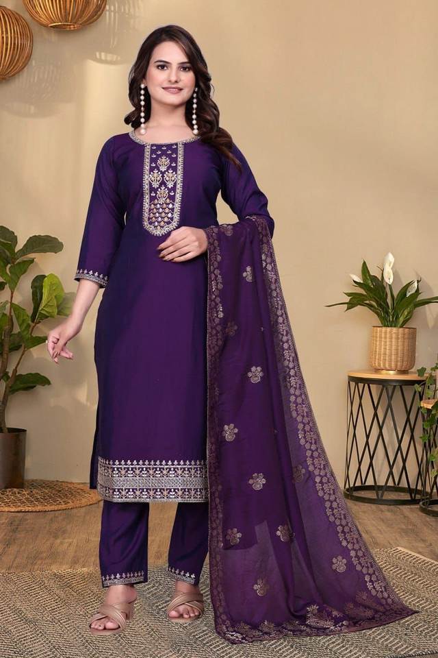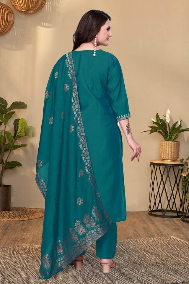ชุดคุर्ตาผ้าโรมันปักลายสำหรับงานปาร์ตี้ พร้อมผ้าคลุมไหล่เข้าชุด และกางเกงผ้าไหมโรมัน มีสองสีให้เลือก