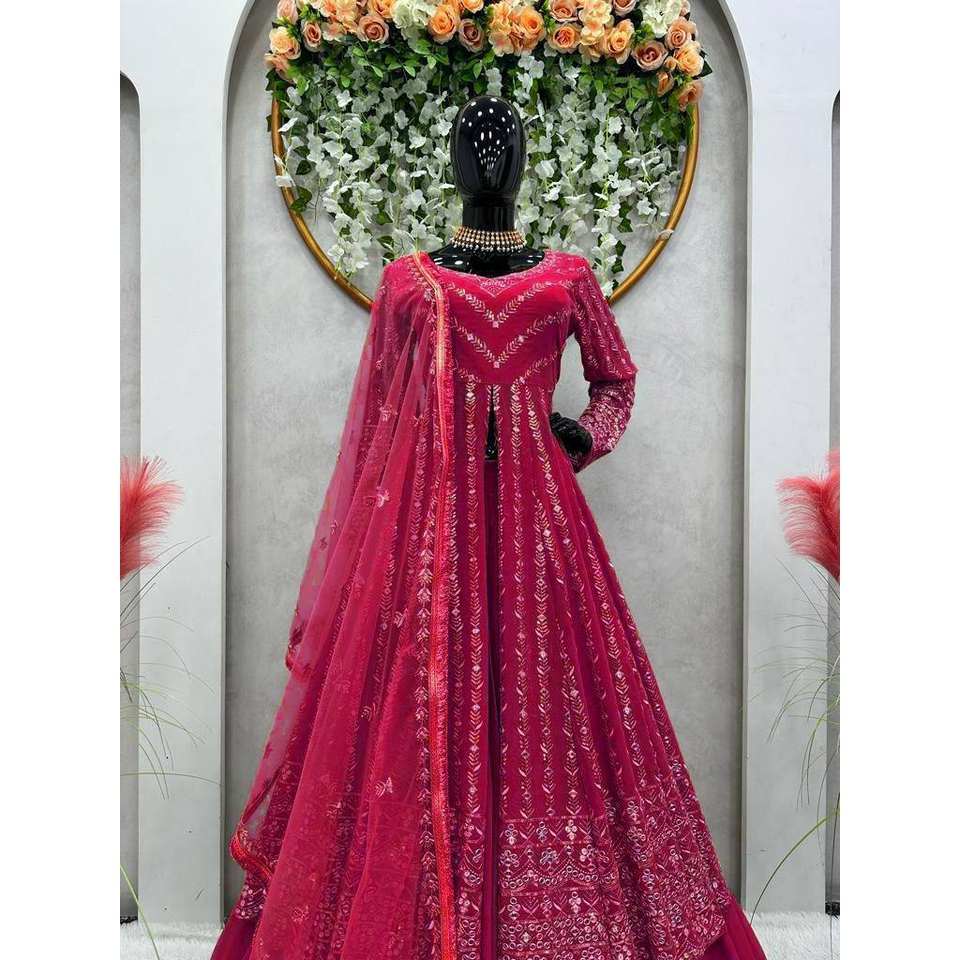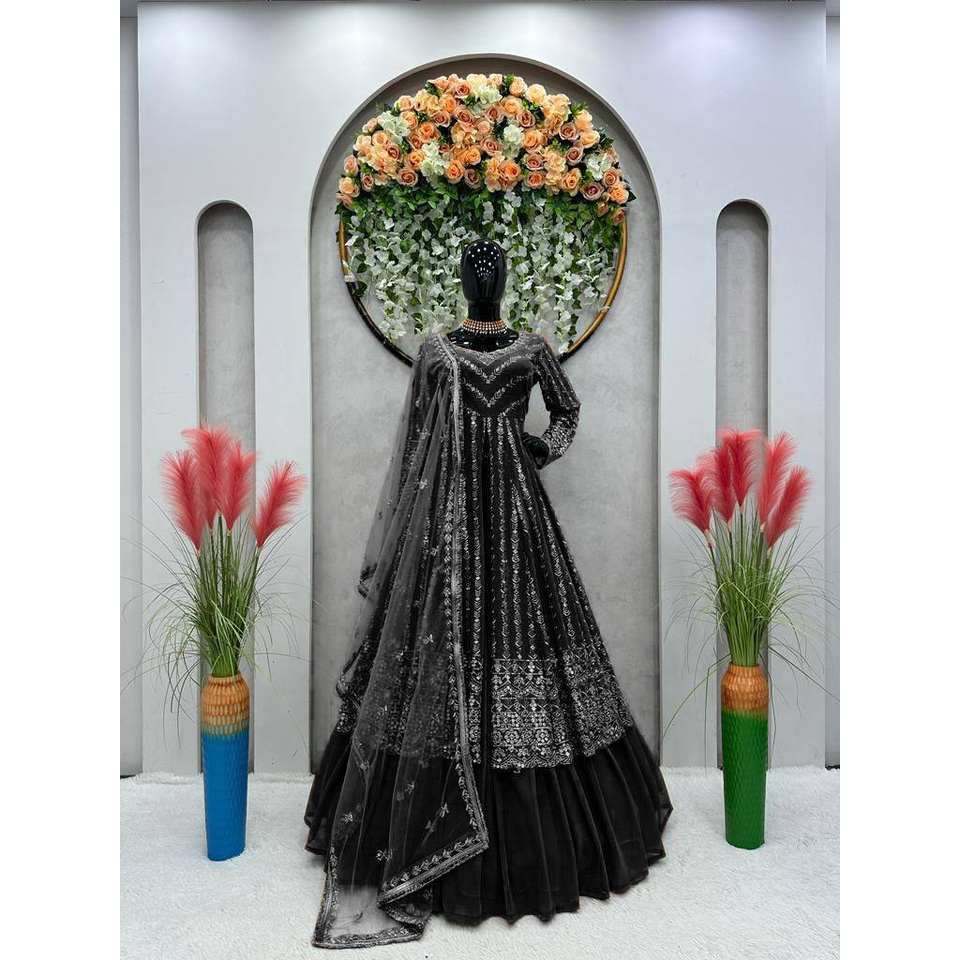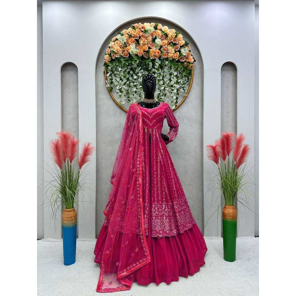 ชุดเลเฮนกาโชลีสีน้ำตาลแบบเย็บกึ่งสำเร็จรูป ประดับด้วยงานปักเลื่อม พร้อมผ้าคลุมไหล่ ทำจากโพลีเอสเตอร์