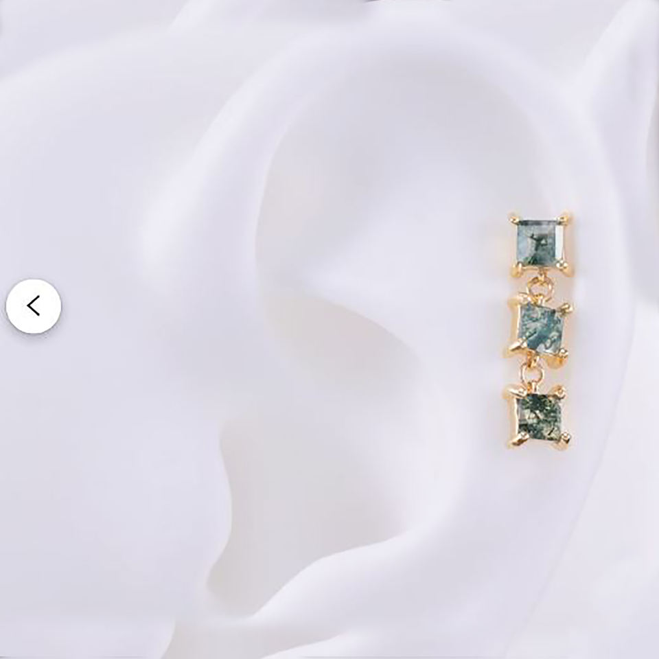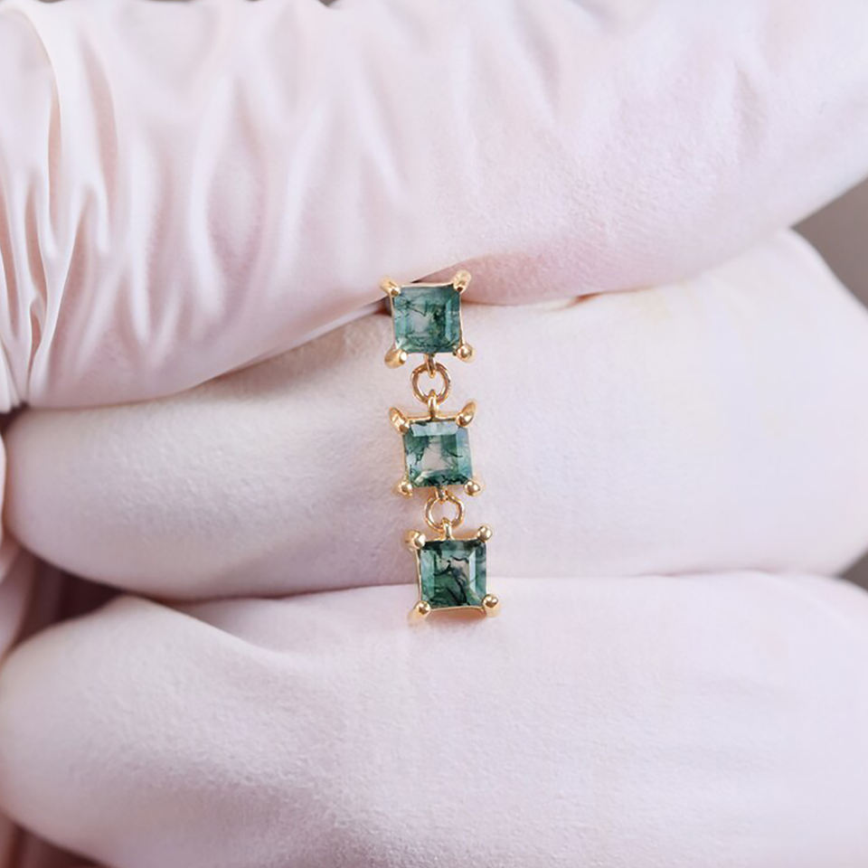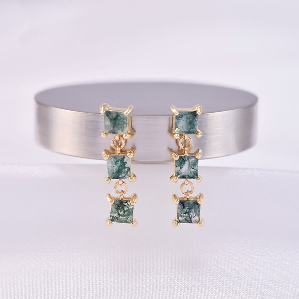 Party Wear Women Jewelry square Shape Natural Moss Agate studded Drop Earring Brass Gold Plated Prong Setting Gemstone Earrings