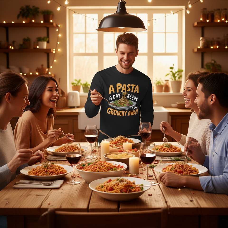 พาสต้าต่อวันช่วยให้แขนยาวออกไปได้อย่างน่ากลัวเสื้อยืดพาสต้างานปาร์ตี้
