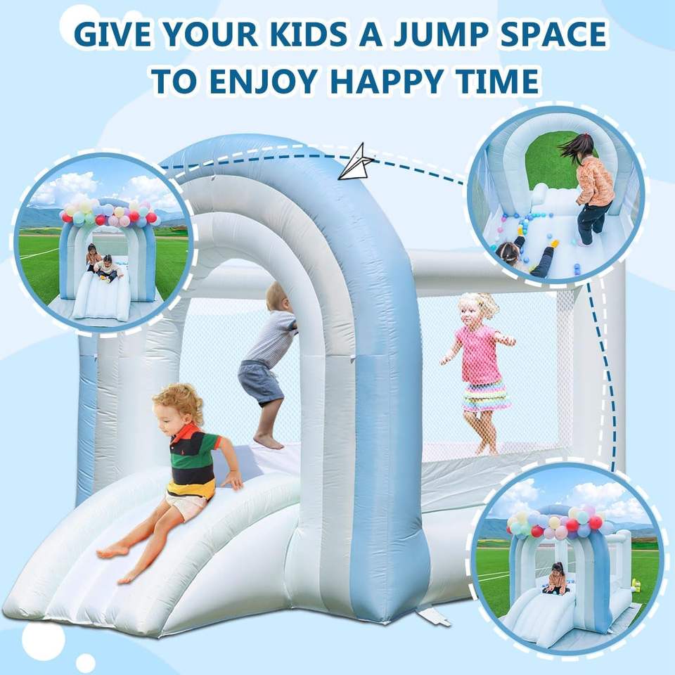 บ้านปราสาทเป่าลมสีฟ้าสีพาสเทลพร้อมสไลด์และหลุมลูกบอลอุปกรณ์สวนสนุกกลางแจ้ง