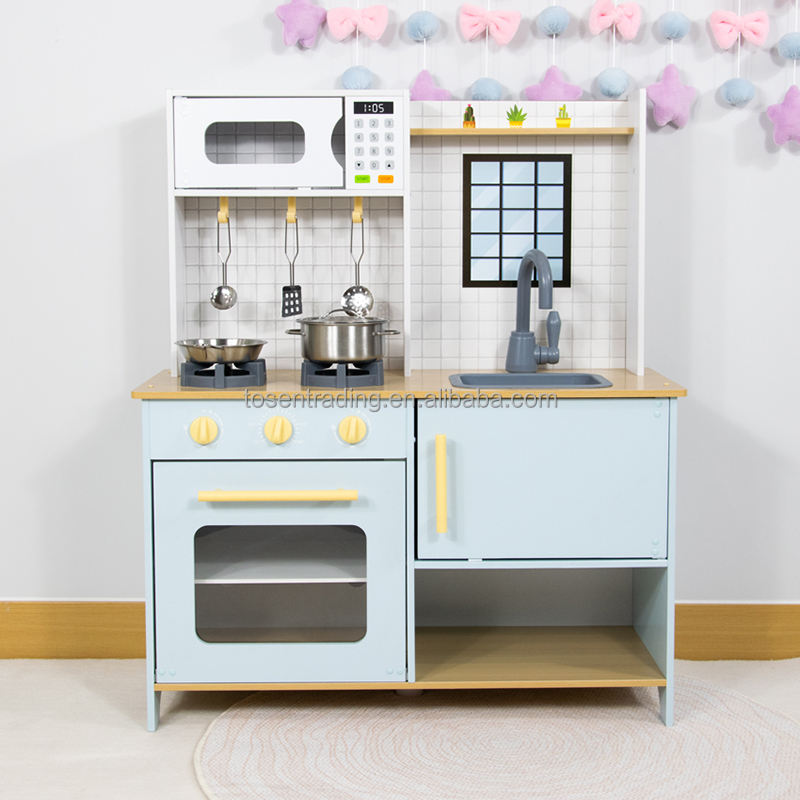 ชุดครัวไม้สีฟ้าพาสเทลสำหรับเด็กเล็ก ชุดของเล่นทำอาหารในบ้าน พร้อมไมโครเวฟ เตาอบ เตาแก๊ส และอ่างล้างจาน