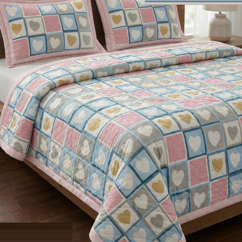 ชุดผ้าคลุมเตียงลายหัวใจสีพาสเทลแบบเย็บติดกัน | ชุดเครื่องนอน 3 ชิ้น ผ้าห่มนุ่มสำหรับเตียงคู่ ผ้าห่มแอร์ พร้อมปลอกหมอน ดีไซน์ทันสมัย