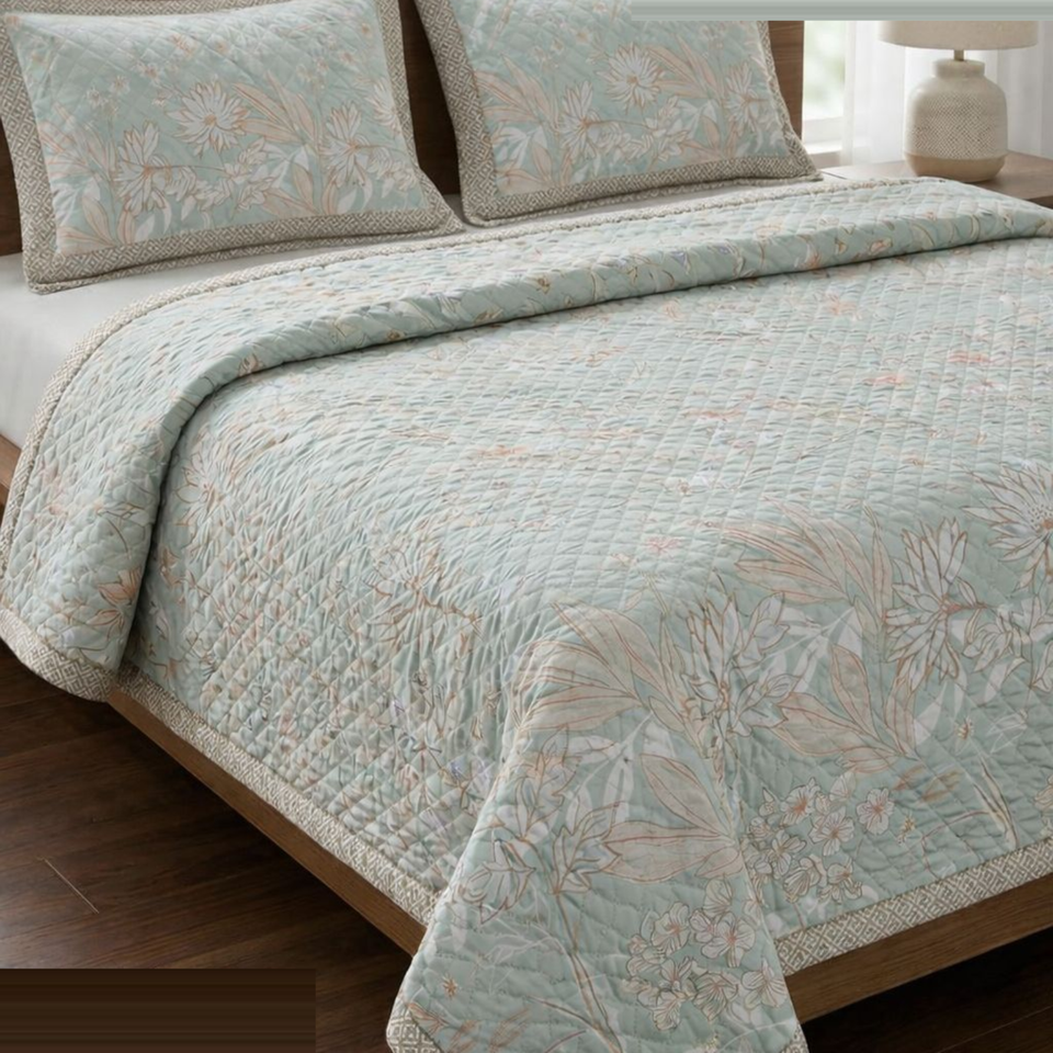 ชุดผ้านวมลายพฤกษศาสตร์สีพาสเทลมิ้นท์ | ชุดผ้าคลุมเตียงคู่แบบหรูหรา 3 ชิ้น ผ้าห่มน้ำหนักเบาสำหรับใช้ในห้องแอร์ พร้อมปลอกหมอนเข้าชุด
