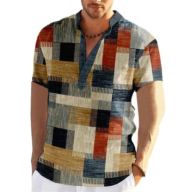 เสื้อพิมพ์ลายบล็อค3D แฟชั่นผู้ชาย, เสื้อยืดแขนสั้นคอตั้งเสื้อยืดผู้ชาย