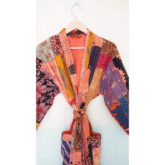 Kantha เสื้อคลุมกิโมโนญี่ปุ่น,เสื้อคลุมกันหนาวเย็บติดด้วยมือมีกระเป๋ามีเข็มขัดหลากสี