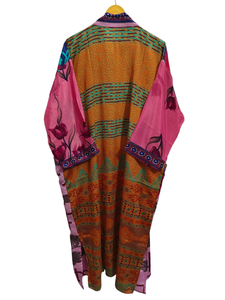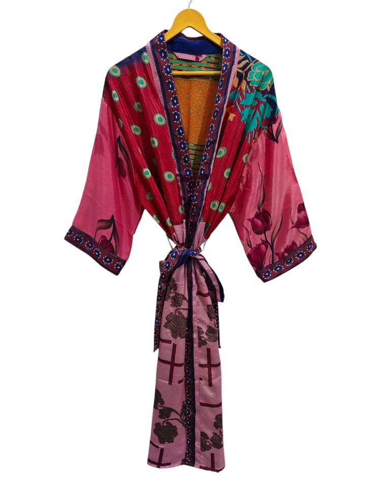 ชุดกิโมโนเย็บปะติดปะต่อกันชุดคลุมบิกินี่เสื้อคลุมยาวสำหรับใส่กลางคืนทำด้วยมือสไตล์วินเทจผ้าไหมส่าหรี
