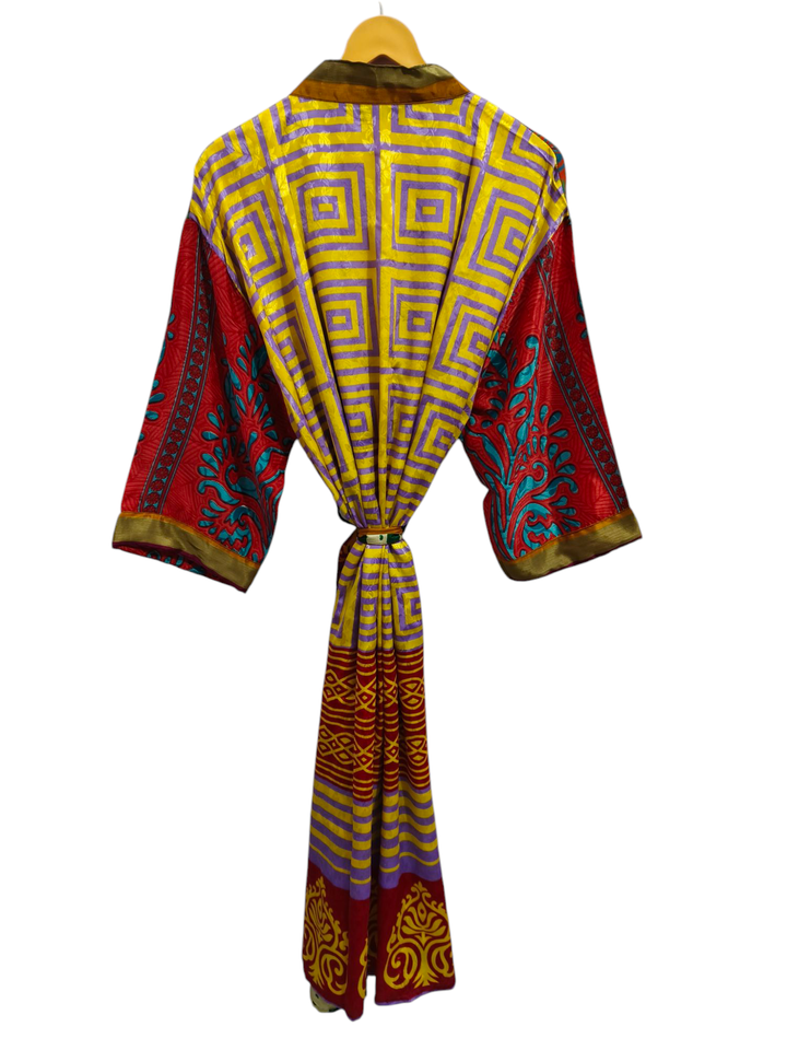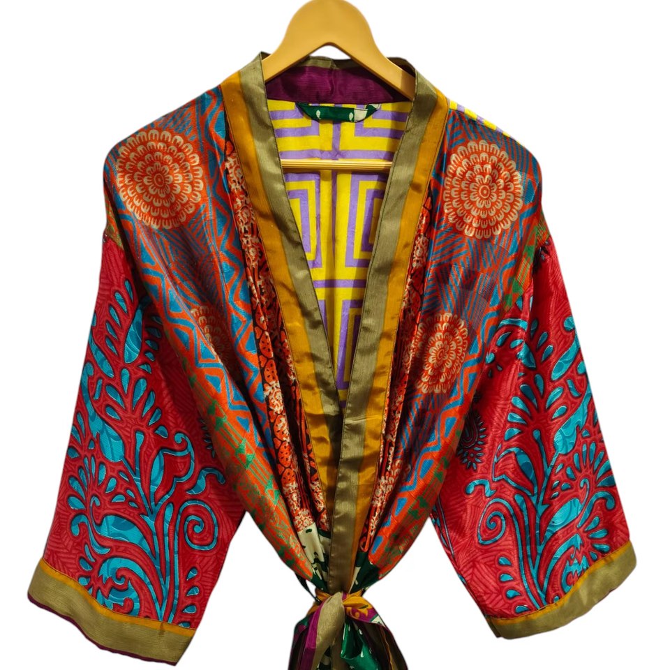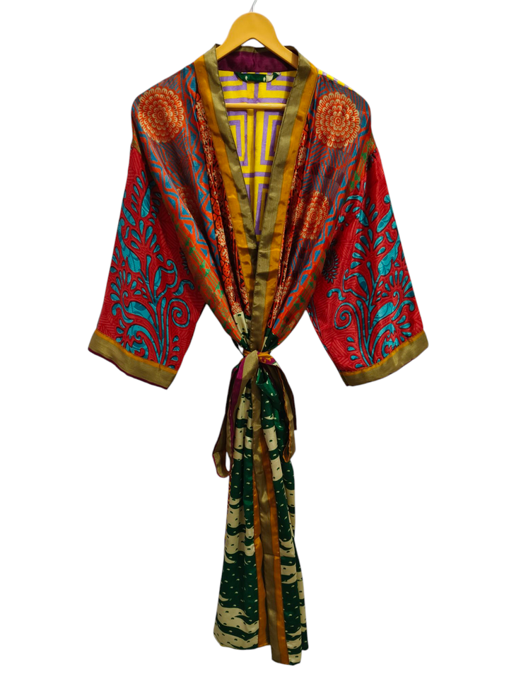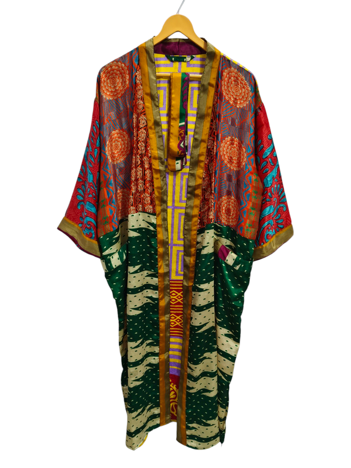 ชุดกิโมโนเย็บปะติดปะต่อกันชุดคลุมบิกินี่เสื้อคลุมยาวสำหรับใส่กลางคืนทำด้วยมือสไตล์วินเทจผ้าไหมส่าหรี