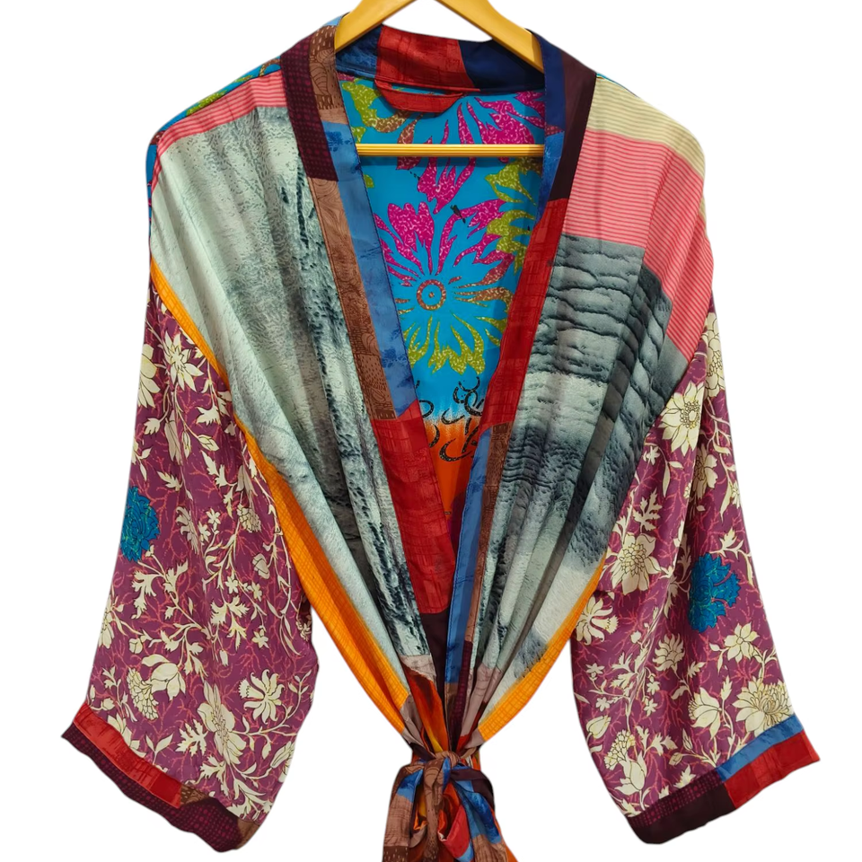 ชุดกิโมโนเย็บปะติดปะต่อกันชุดคลุมบิกินี่เสื้อคลุมยาวสำหรับใส่กลางคืนทำด้วยมือสไตล์วินเทจผ้าไหมส่าหรี