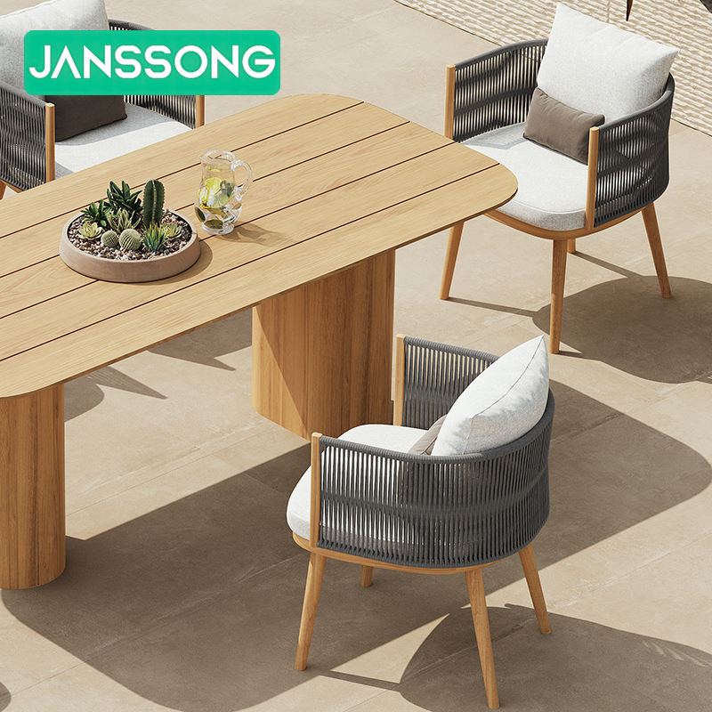 ชุดโต๊ะรับประทานอาหารสำหรับลานบ้าน ชุดรับประทานอาหารกลางแจ้งสำหรับโรงแรม โต๊ะและเก้าอี้ในสวน ชุดเฟอร์นิเจอร์สวนไม้สักสุดหรู เก้าอี้กลางแจ้งแบบเชือก