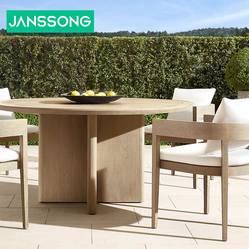 ชุดโต๊ะรับประทานอาหารกลางแจ้งทรงกลมไม้สไตล์โมเดิร์น พร้อมเก้าอี้มีพนักแขน สำหรับวิลล่า ทำจากไม้สัก คุณภาพสูง ทนทาน เหมาะสำหรับโรงแรมระดับไฮเอนด์