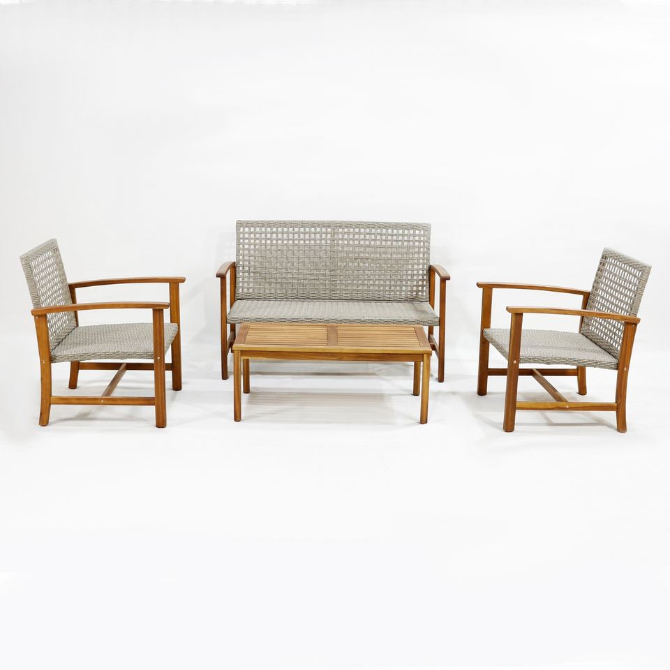 ชุดโซฟา4ชิ้นโครงไม้อะคาเซียพร้อมหวายแบนคู่และโต๊ะกาแฟไม้สีธรรมชาติ