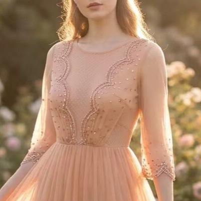 ผู้ผลิตชุดราตรีผ้าทูลล์ประดับลูกปัดสีพีช ขายส่งชุดราตรีแบบหลายชั้น ผู้จัดจำหน่ายชุดพรอมแบบขายส่ง โรงงานรับผลิตตามสั่ง OEM