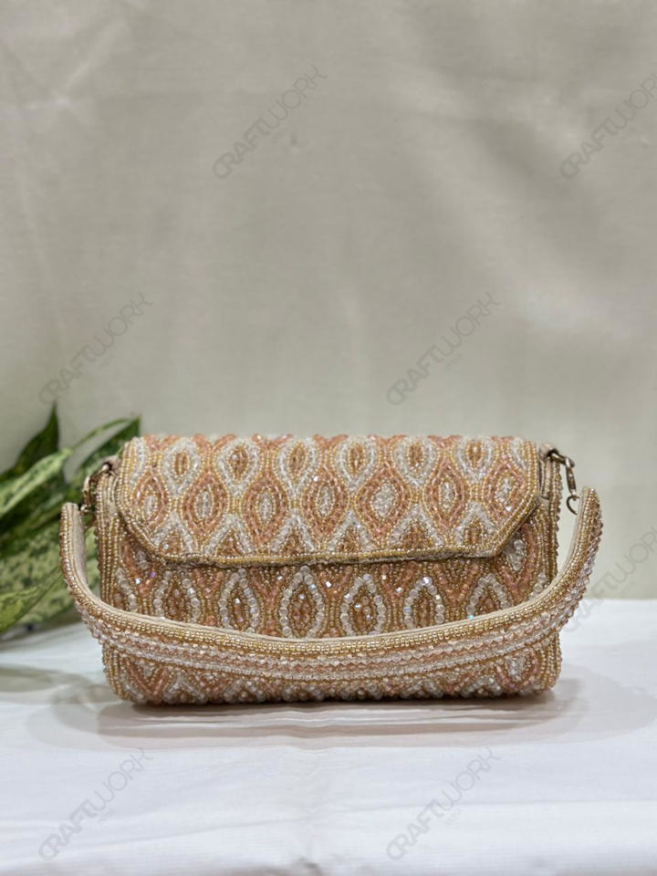 กระเป๋าสะพายไหล่ทรงแข็งแบบมีฝาปิดประดับลายเรขาคณิตสีพีชแชมเปญ