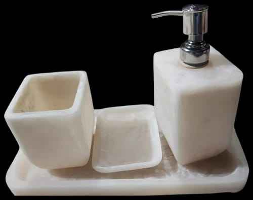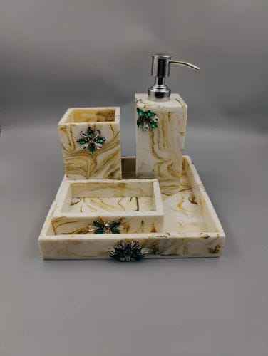 ชุดอุปกรณ์ห้องน้ำเรซิ่นลายพีชควอตซ์ ประกอบด้วย กล่องใส่กระดาษทิชชู่ ที่กดสบู่เหลว ที่วางแปรงสีฟัน ถาดวางสบู่ และอุปกรณ์อื่นๆ