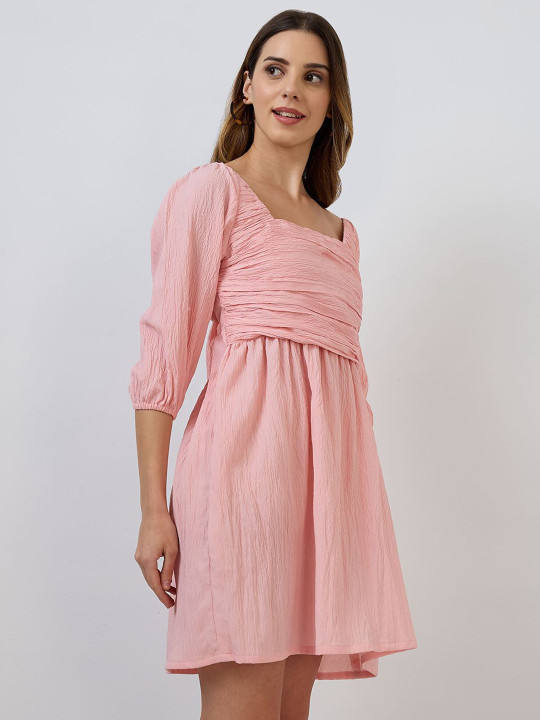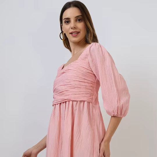 เดรสสีพีชทรงเข้ารูปและบานออกด้านล่าง แขนพองสามส่วน ความยาวระดับเข่า ผ้าชีฟองลายดอกไม้ สำหรับผู้หญิง