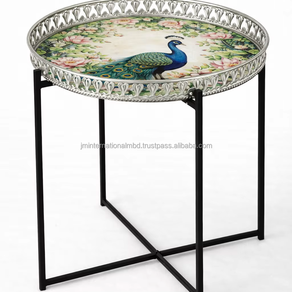 Traditional Peacock Pichwai Print Silver Tray Table with Black Foldable Metal Legs Living Room Furniture
