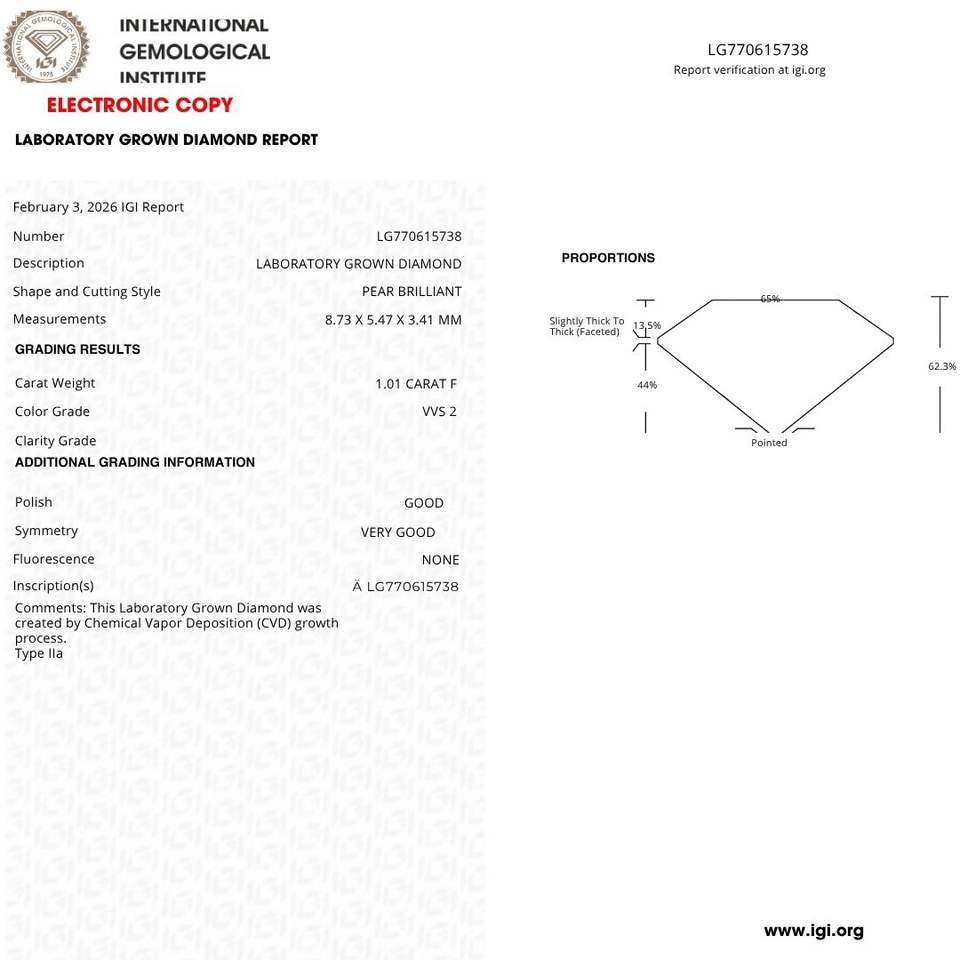 เพชรทรงลูกแพร์ 1.01 กะรัต สี F ความสะอาด VVS2 เพชรเพาะเลี้ยงในห้องปฏิบัติการ รับรองโดย IGI