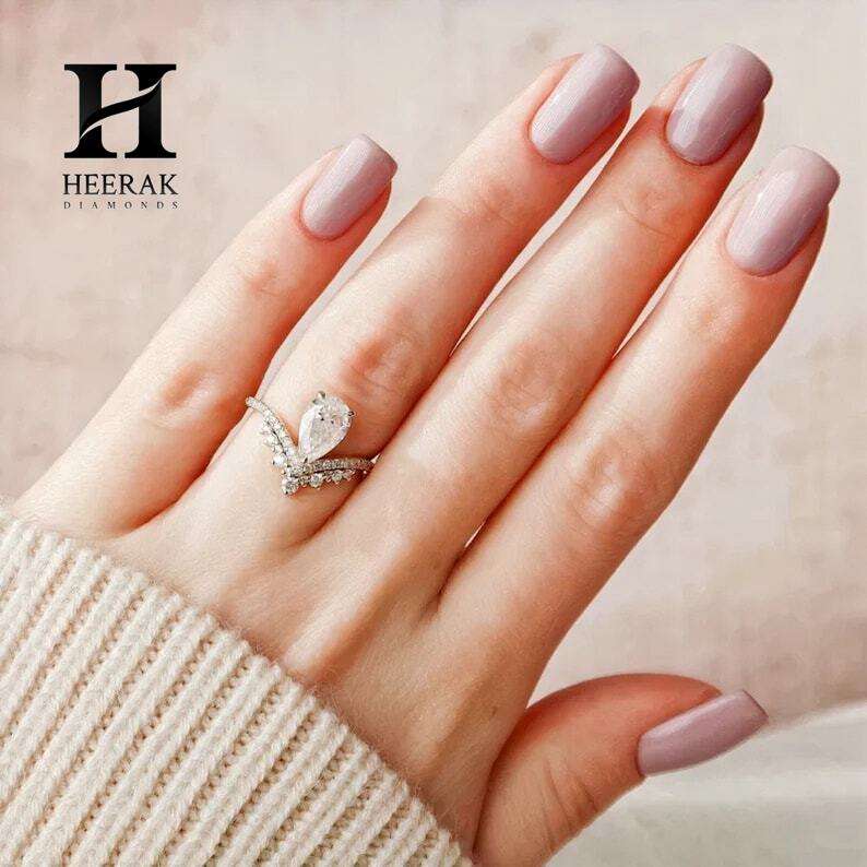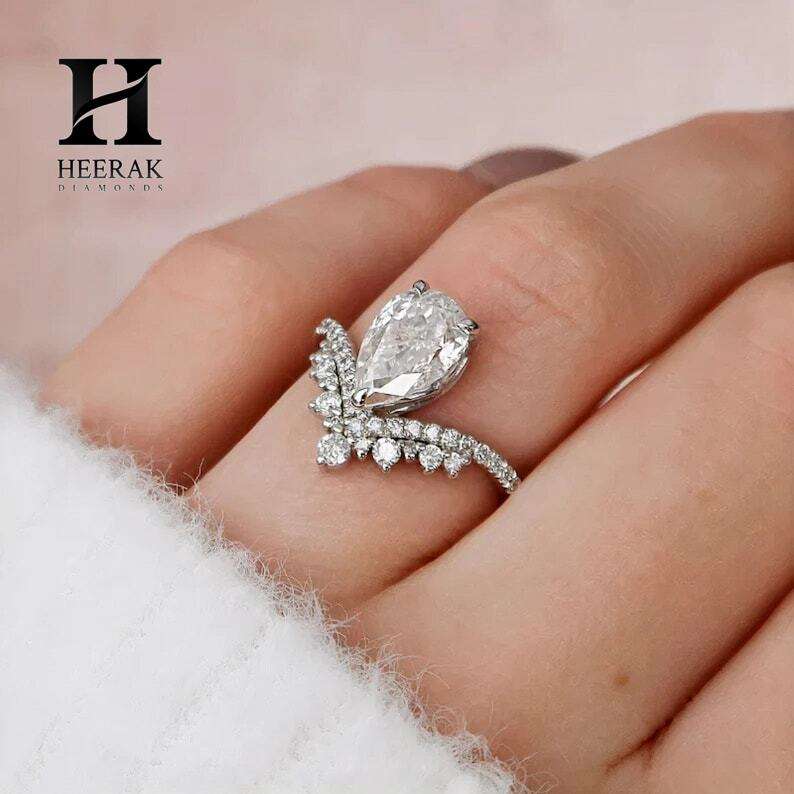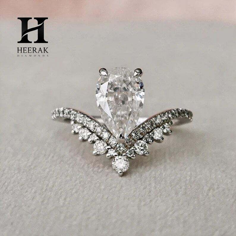 แหวนหมั้นเพชรทรงลูกแพร์เพาะเลี้ยงในห้องปฏิบัติการ ทองคำขาว 14K แหวนแต่งงานรูปตัววีประดับโมอิสซาไนต์ เครื่องประดับหรูหราจากโรงงานผลิต