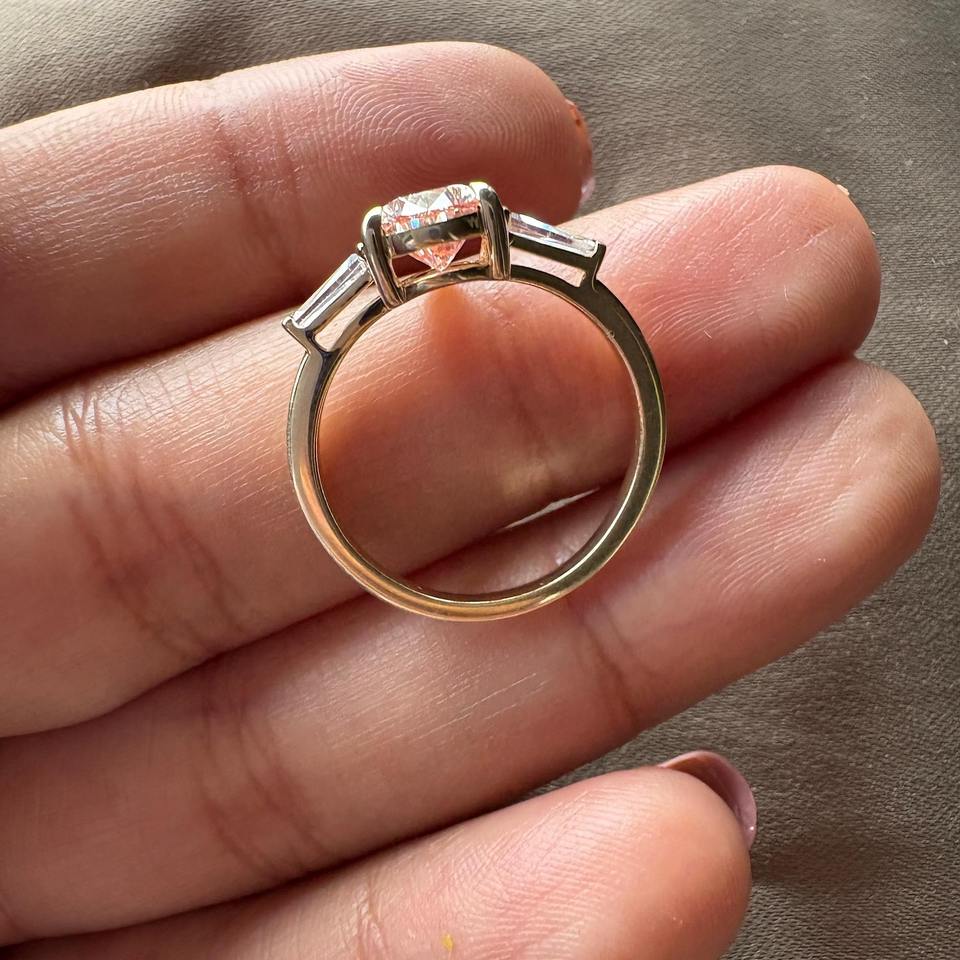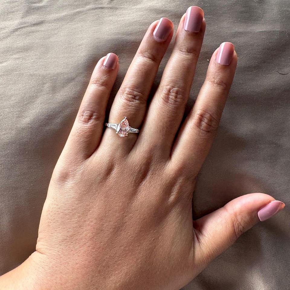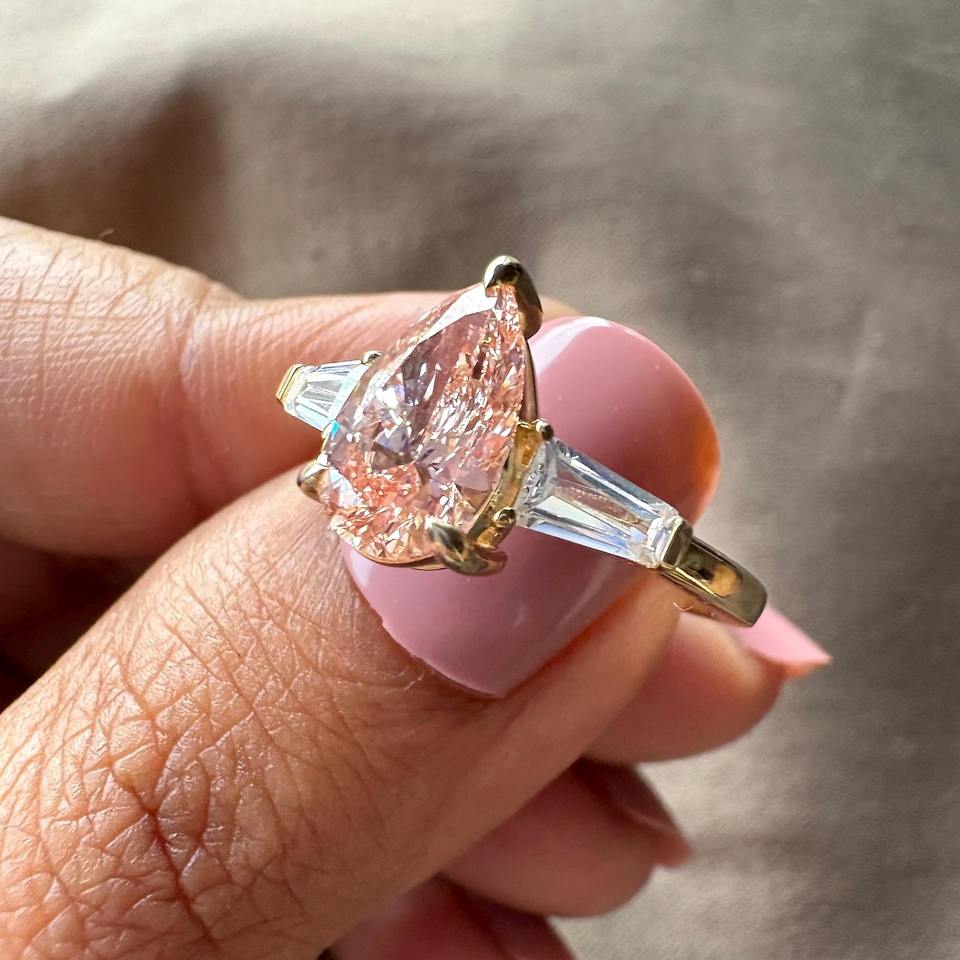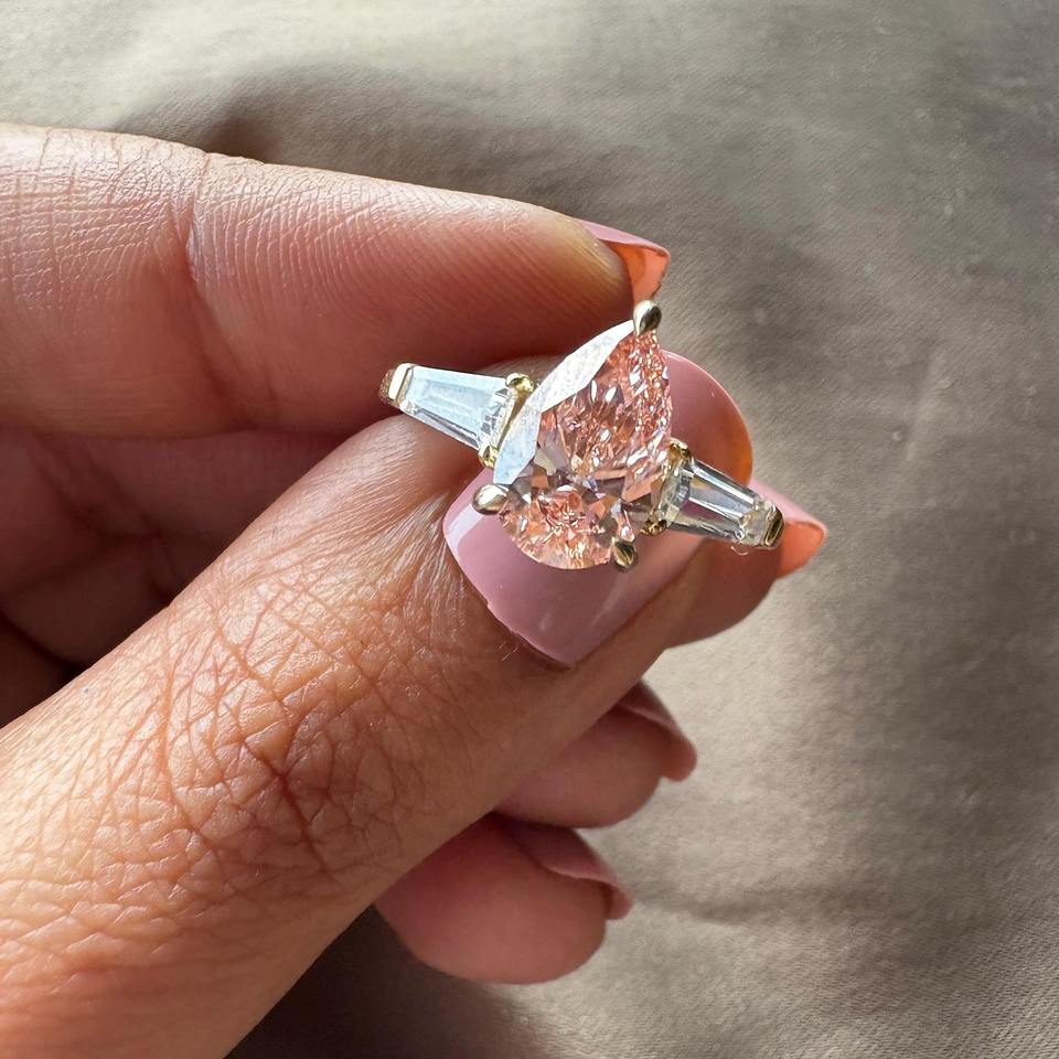 แหวนหมั้นเพชรทรงลูกแพร์สีชมพูเพาะเลี้ยงในห้องปฏิบัติการ ประดับเพชรทรงบาแก็ตต์ 3 เม็ด แหวนแต่งงานทอง 14k ราคาประหยัด