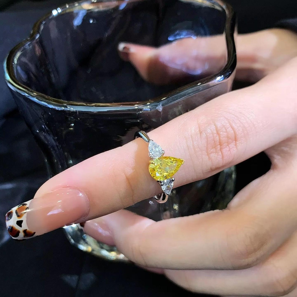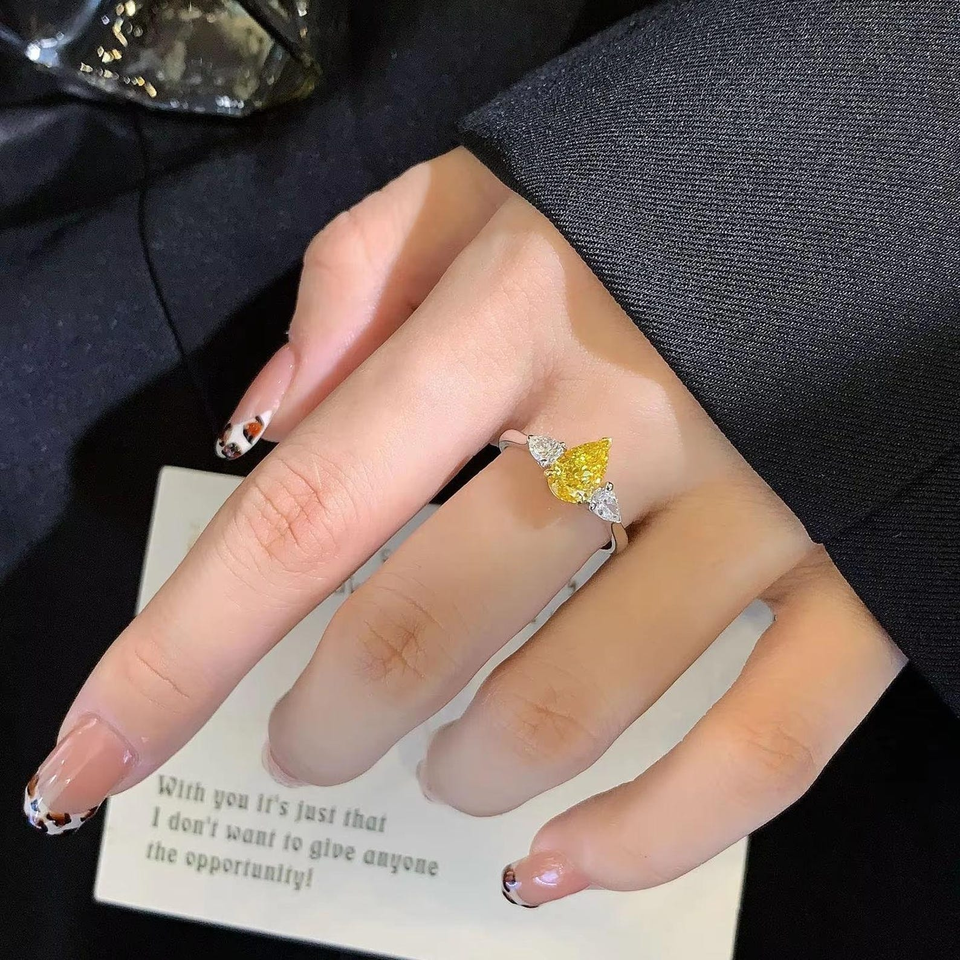 แหวนเพชรทรงลูกแพร์สีเหลืองสดใสสามเม็ด สำหรับวันครบรอบแต่งงาน/หมั้น ทำจากเงินแท้ 925 ของขวัญสำหรับเจ้าสาว
