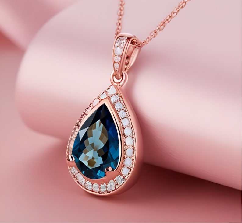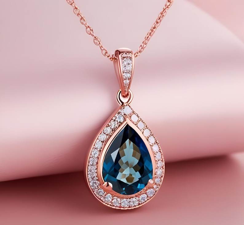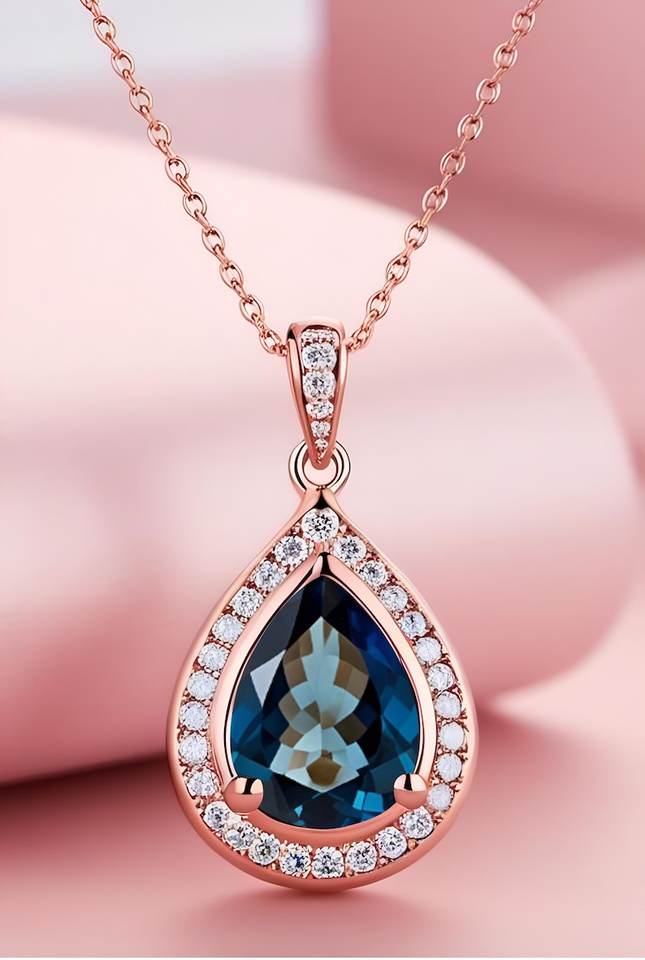 สร้อยคอเพียร์ลอนดอนบลูโทปาซ โรสโกลด์ ฮาโล เงินสเตอร์ลิง จี้ห้อยคอจากอัญมณีธรรมชาติ