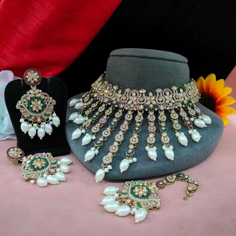 ชุดสร้อยคอไข่มุกพร้อม Maang Tikka มุกที่มีคุณภาพดีที่สุด, เพทายและ kundan ตกแต่งด้วยทองคำที่สวยงามและสวยงาม