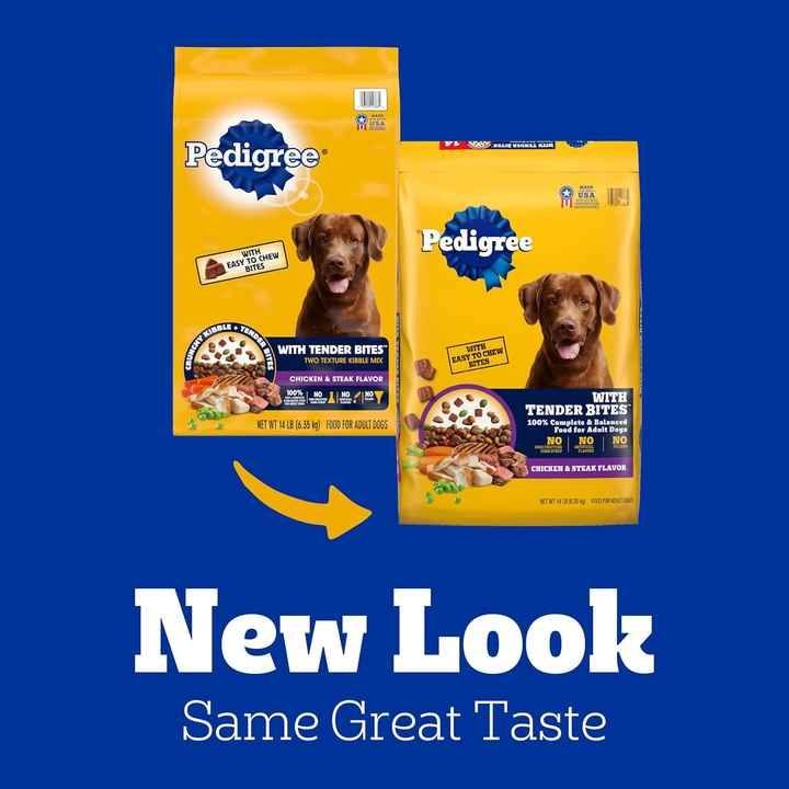 Pedigreee กับอ่อนโยนกัดโภชนาการที่สมบูรณ์ผู้ใหญ่อาหารสุนัขแห้งไก่และสเต็กรส14ปอนด์. กระเป๋า