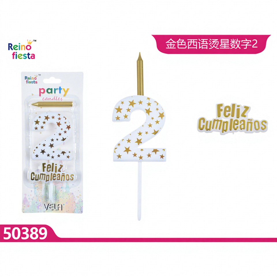 เทียนวันเกิดรูปเค้กประดับลายดาวทองคำหมายเลข 2 ของ Peiyong พร้อมข้อความภาษาสเปน สำหรับงานปีใหม่ อีสเตอร์ บรรจุกล่อง