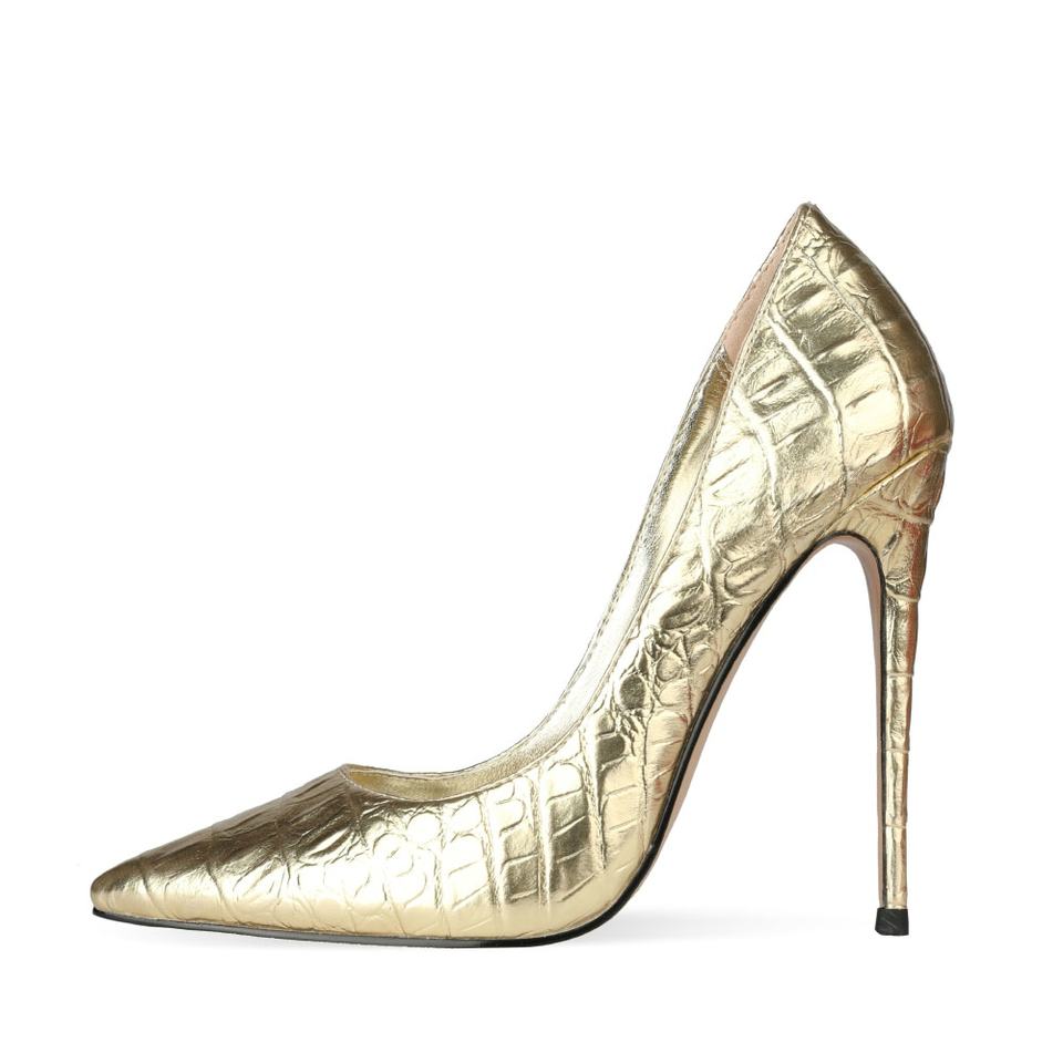 รองเท้าส้นเข็มผู้หญิง สีเงินเมทัลลิก หนัง PU ลายจระเข้ หัวแหลม ส้นสูง รองเท้าเซ็กซี่สำหรับงานปาร์ตี้