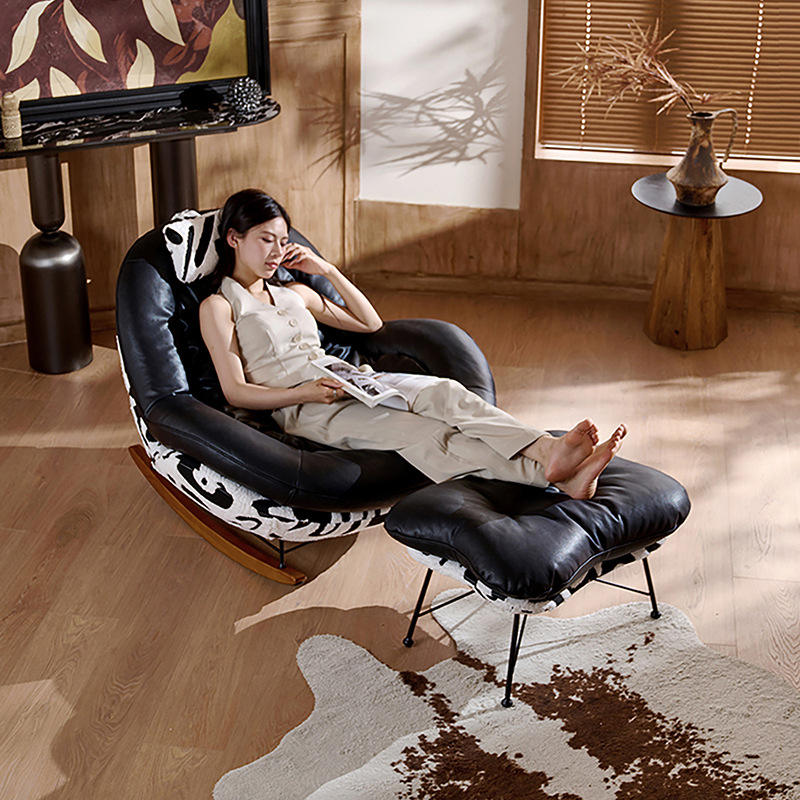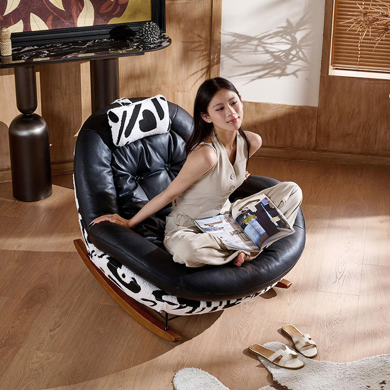 เก้าอี้โยกเพนกวิน เก้าอี้โซฟาเดี่ยว หนังสีดำ ฐานหนังวัว ทันสมัย สำหรับห้องนั่งเล่น เก้าอี้พักผ่อนพร้อมโครงไม้โยก