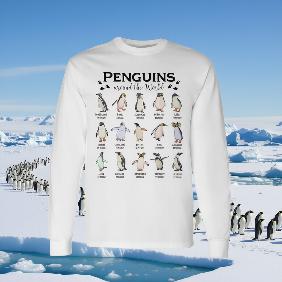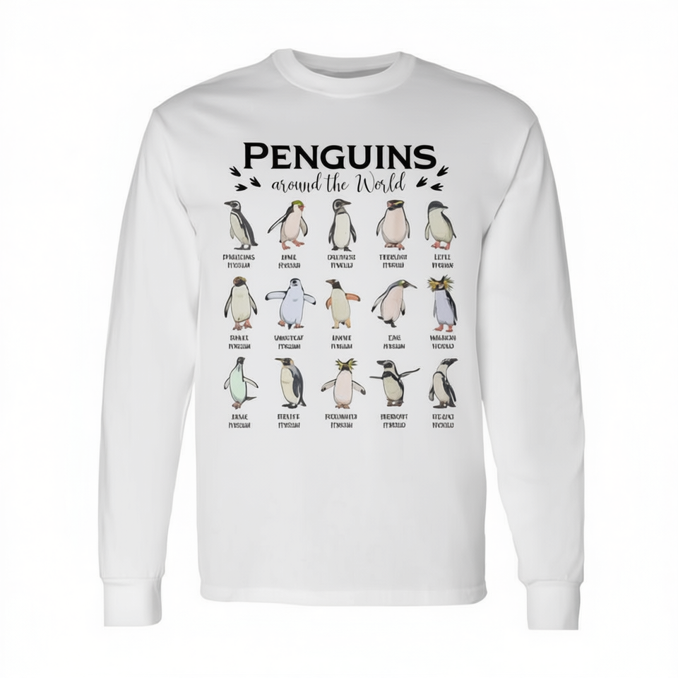 เสื้อยืดแขนยาวลายเพนกวินรอบโลก ดีไซน์เพื่อการศึกษาสำหรับคนรักเพนกวิน