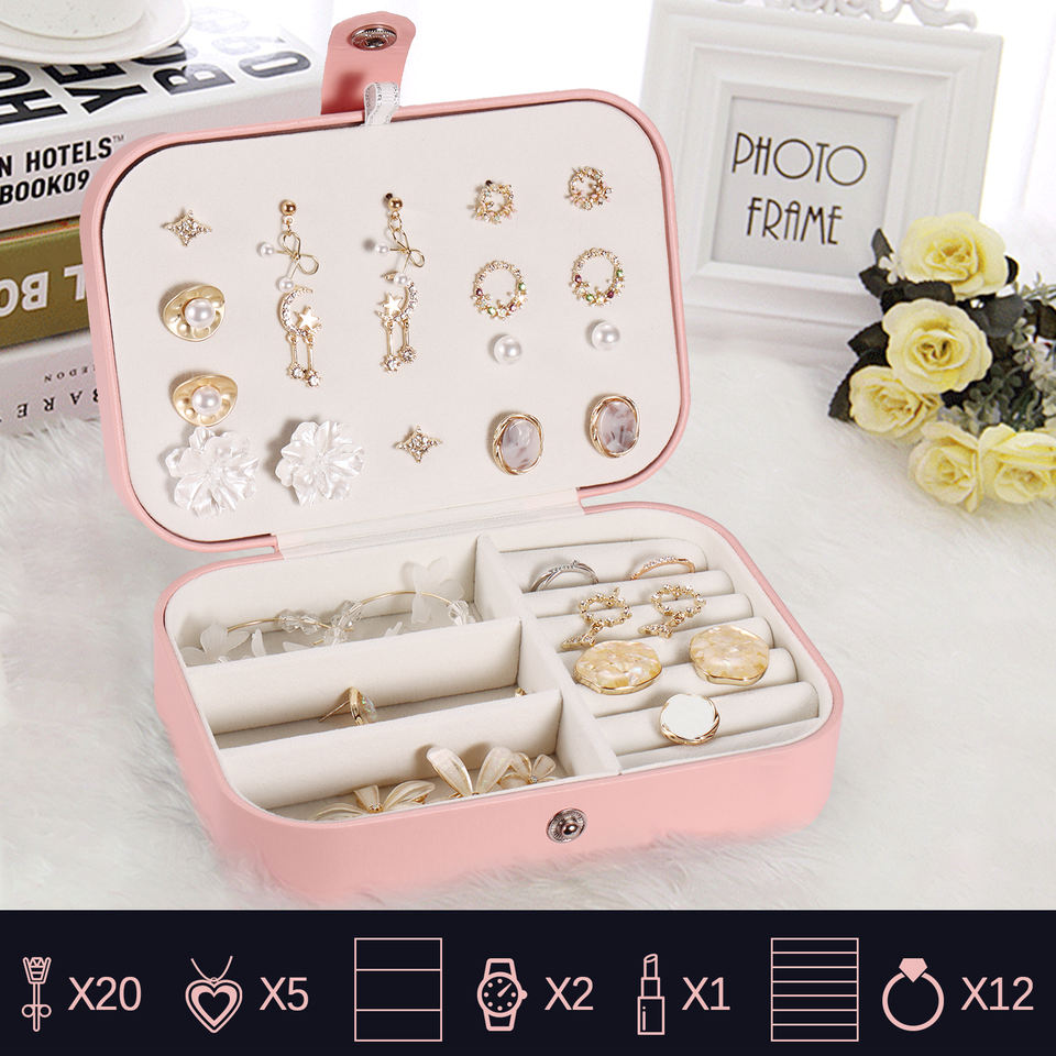 Penobon กล่องใส่เครื่องประดับแบบพกพาทำจากหนัง PU สีชมพู2ชั้นทันสมัยสำหรับผู้หญิงที่เก็บแหวน