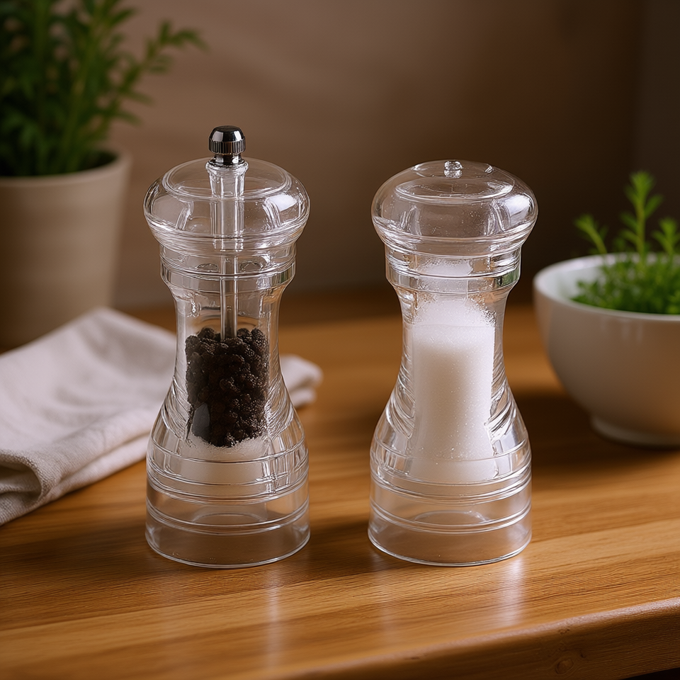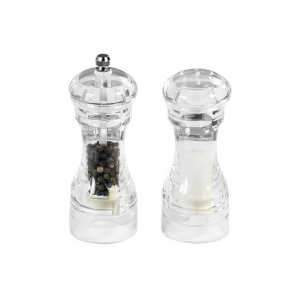 ชุดเครื่องบดพริกไทยและเกลือ 2 ชิ้น ทำจากแก้วใสพร้อมฝาโลหะ สำหรับใช้ในครัว