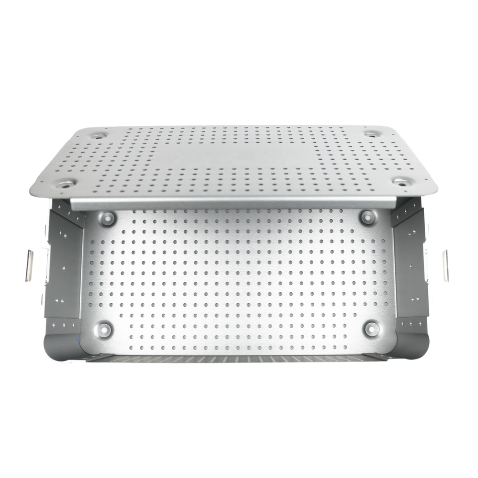 กล่องอบฆ่าเชื้อเครื่องมือผ่าตัดอะลูมิเนียมแบบมีรูพรุนพร้อมฝาปิด