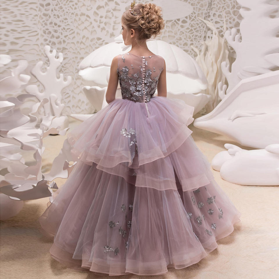 ชุดเดรสปักลายลูกไม้ประดับดอกไม้สีม่วงใหม่สำหรับเด็กโต ชุดเจ้าหญิงสำหรับงานแต่งงาน งานวันเกิด