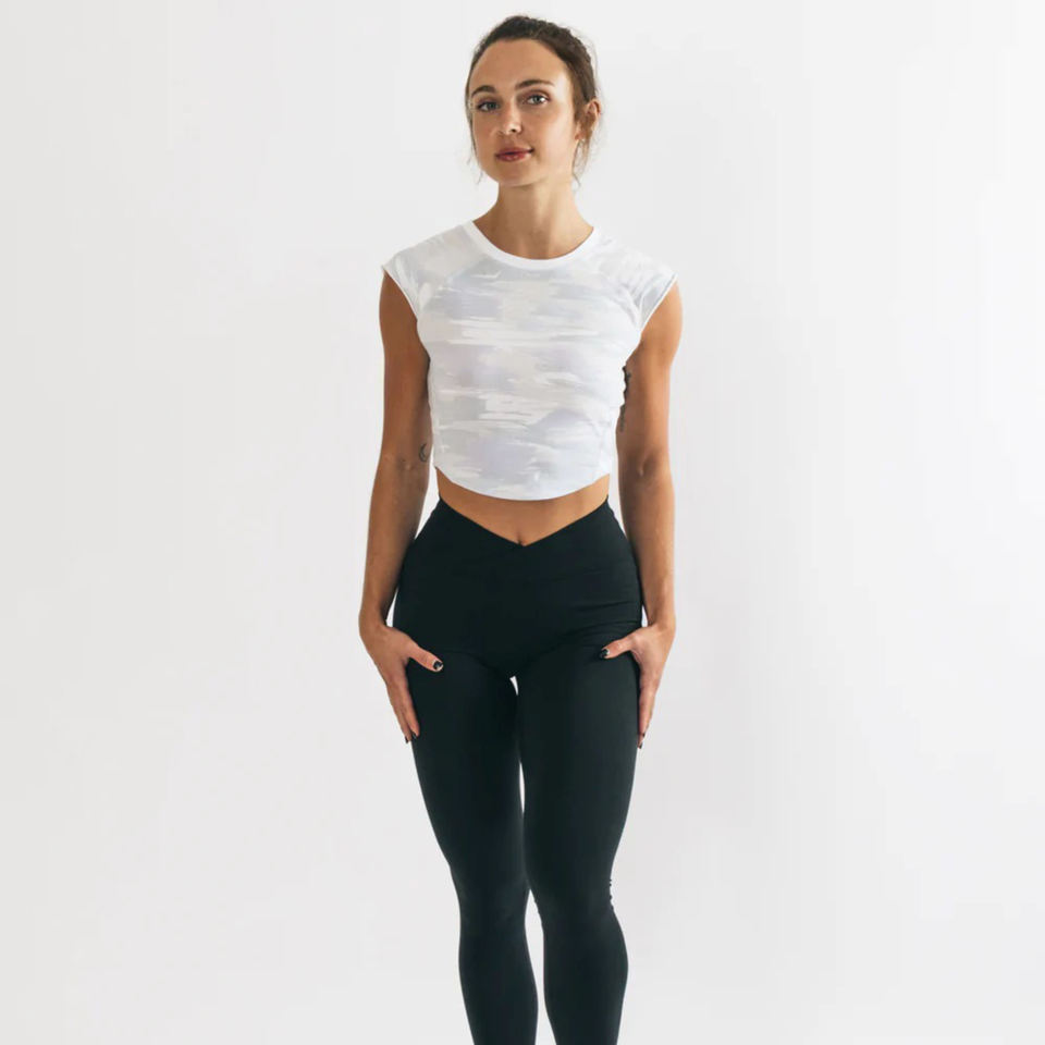 Performance Fit 95% Cotton 5% Spandex Fitted Cap Sleeves Raglan Shaped Crew Neckline Women Arctic Canvas Camo Scoop Hem Crop T-S