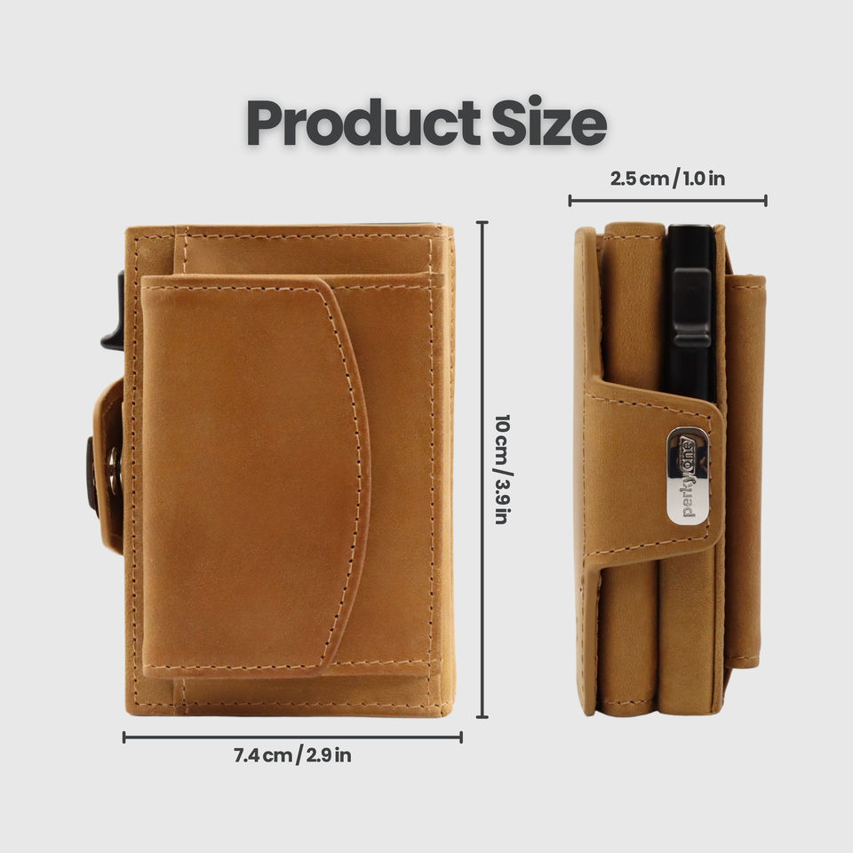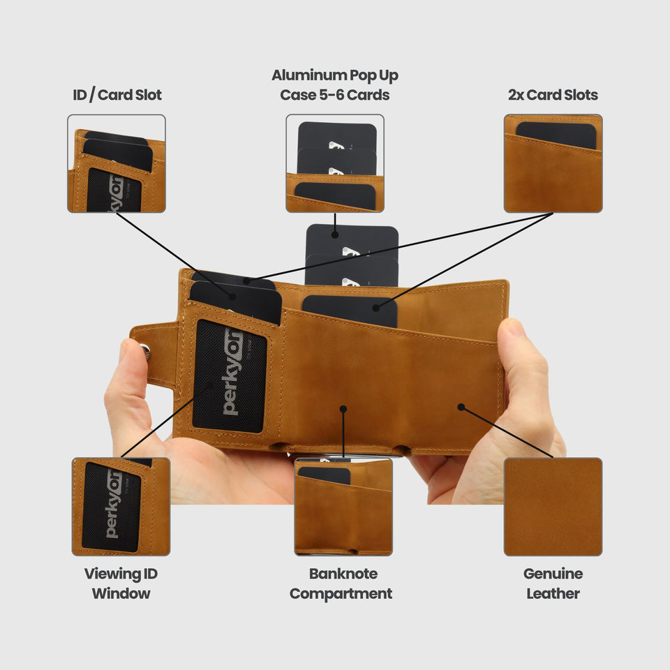 Perkyone Dapper Everyday Compact Genuine Leather Wallet Slim Long Design Zipper Closure RFID Feature Open Type Logo Pattern