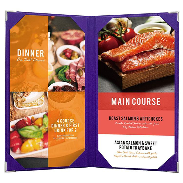 ปกเมนูหนังเทียมสีม่วงลายหนังแท้สำหรับร้านอาหาร แบบ 2 หน้า พร้อมมุมยึดติด