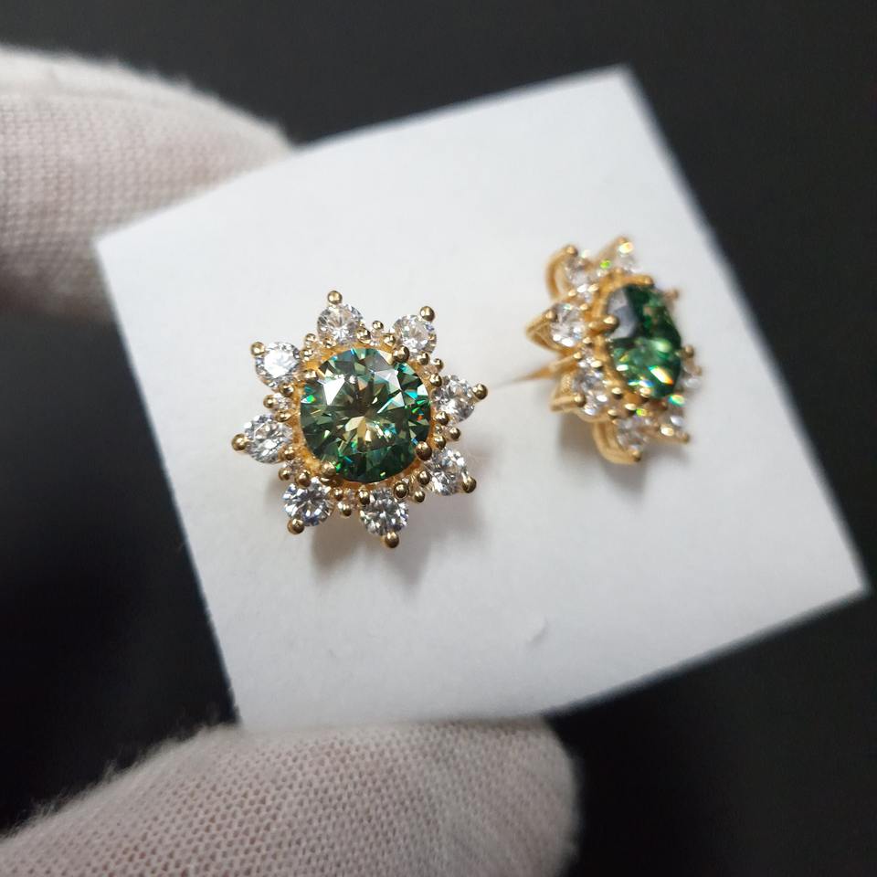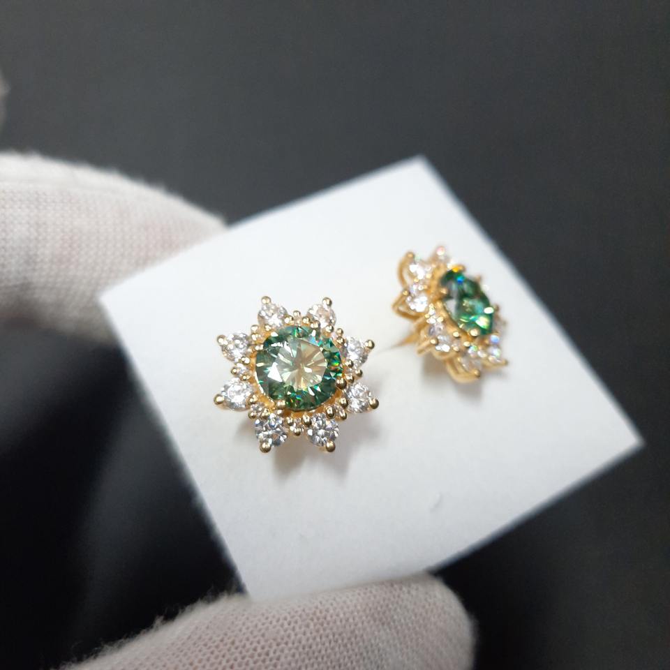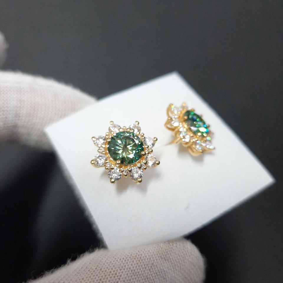 ต่างหูมอสซาไนต์ทรงกลมสีฟ้าเขียว 2 กะรัต ดีไซน์ดอกไม้ เรียบหรู เงินแท้ 925 ประดับเพชร ราคาดีที่สุด