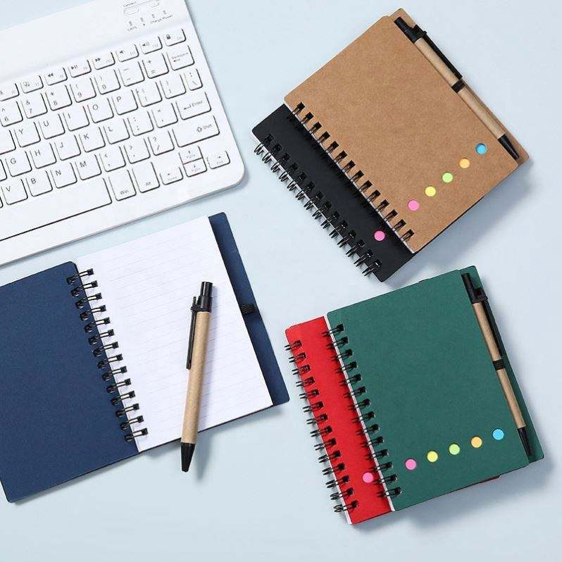 สมุดโน้ตสันห่วงขนาด 4.5 x 5.5 นิ้ว ปกกระดาษคราฟท์ พร้อมกระดาษโน้ตแบบมีกาว แถบสีต่างๆ ของขวัญส่งเสริมการขายขายส่งสำหรับผู้ใช้ปากกา