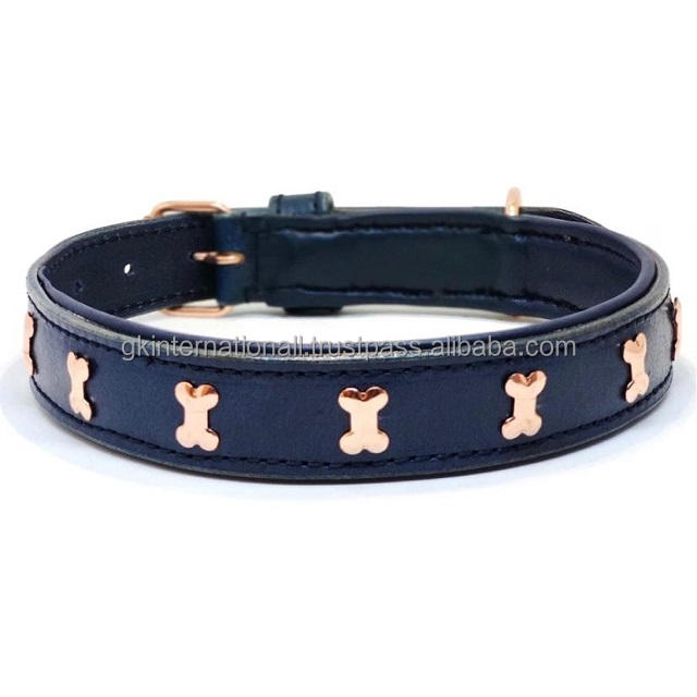 Personalized Adjustable Leather Dog Collar for All Sizes Pets Designed With 1 Row of Brass Bones & Buckle Padded Dog Pet Collar