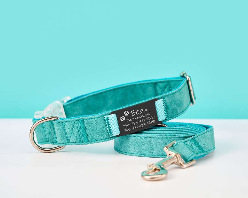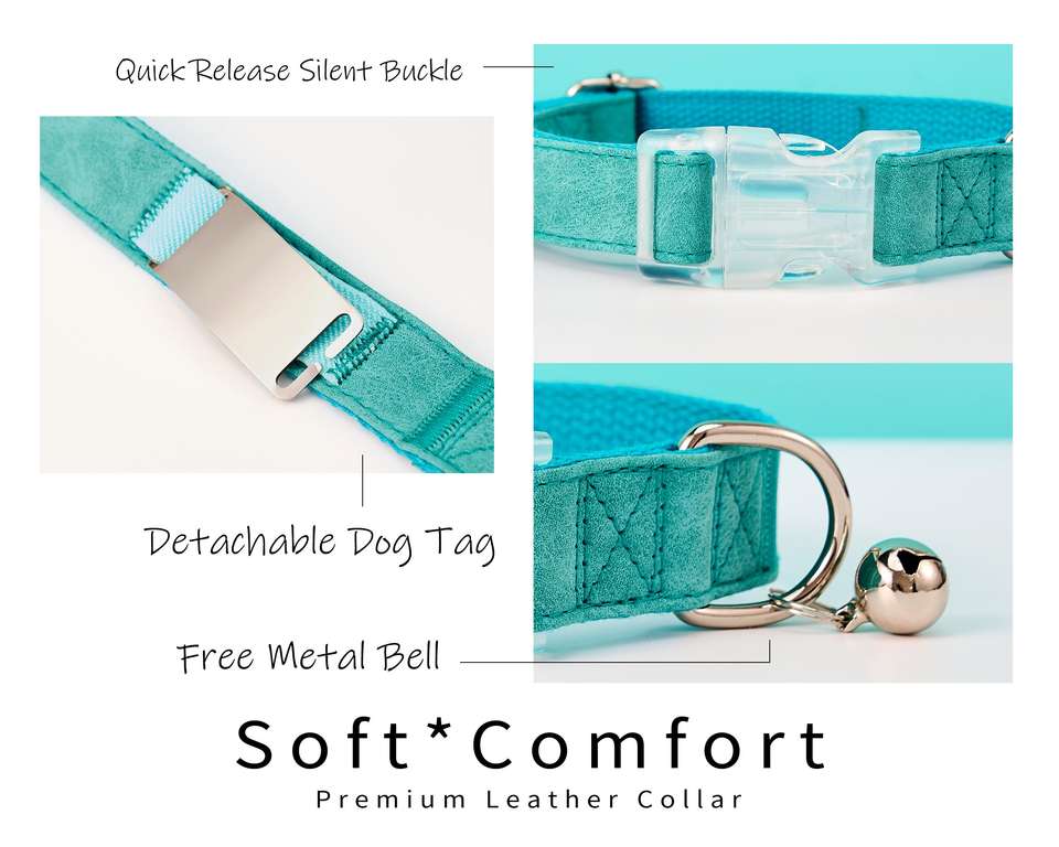 ชุดสายจูงปลอกคอสัตว์เลี้ยงในน้ำที่มีลักษณะเฉพาะตัวปลอกคอแมวหนังนิ่มแบบกำหนดเองป้ายโลหะสลักชื่อพร้อมกระดิ่งฟรีสุนัขที่ไม่เหมือนใคร