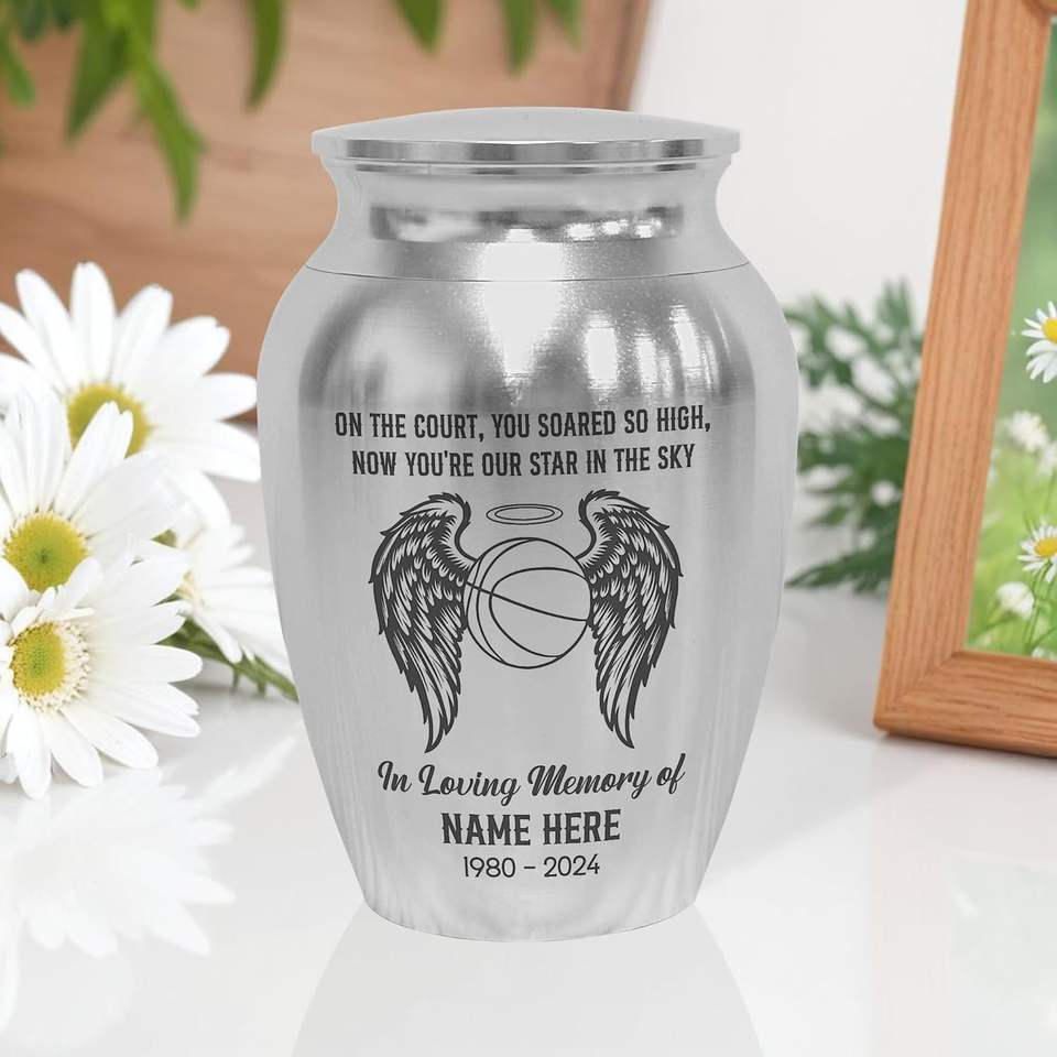 โกศขนาดเล็กลายบาสเก็ตบอลส่วนบุคคลสำหรับขี้เถ้าของมนุษย์เป็นของชำร่วยสำหรับขี้เถ้าของมนุษย์ในหน่วยความจำที่กำหนดขนาดเองสีเงิน