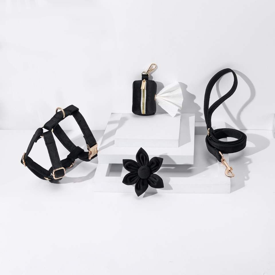 ชุดสายจูงสุนัขสีดำส่วนบุคคลที่ใส่ถุงอุจจาระสัตว์เลี้ยงที่ถอดออกได้อย่างรวดเร็วผ้ากำมะหยี่ไม่ดึง