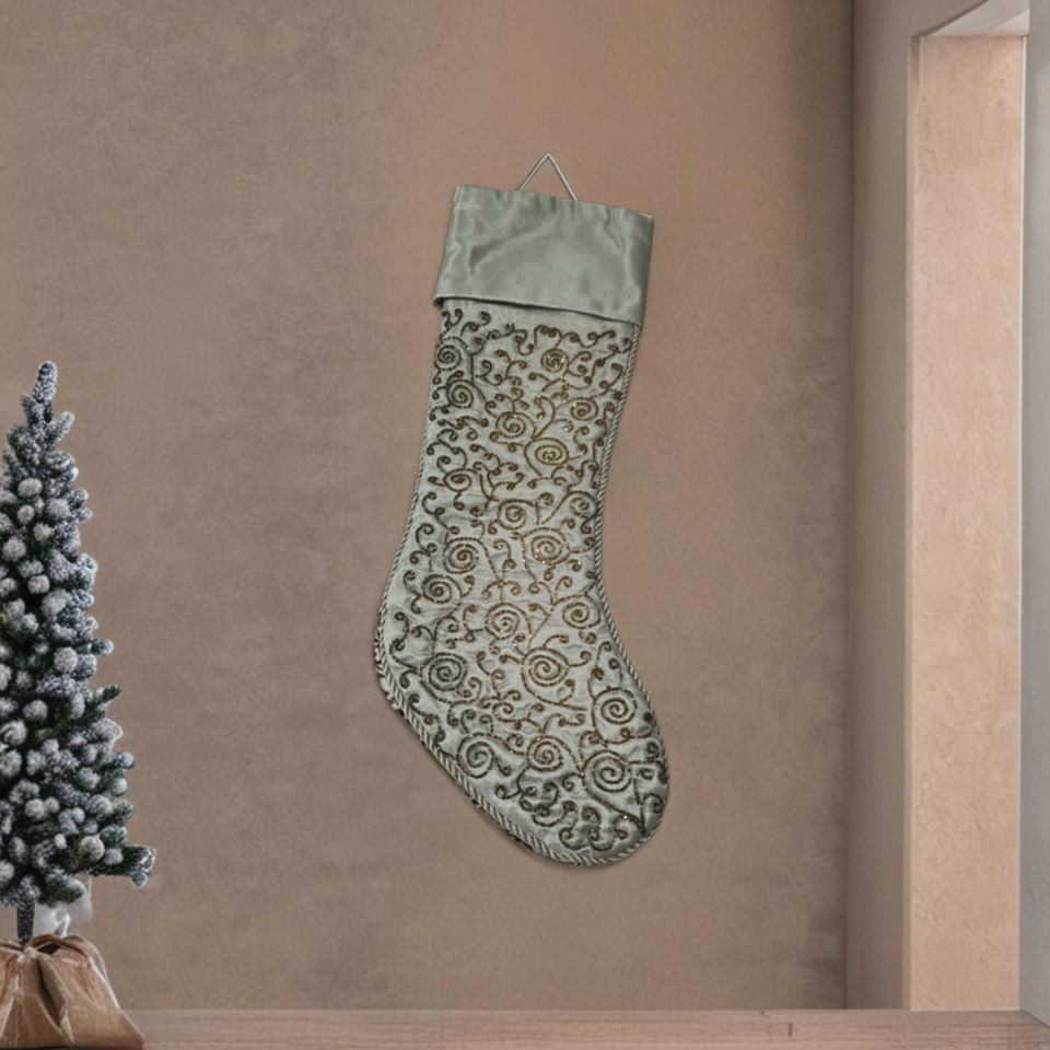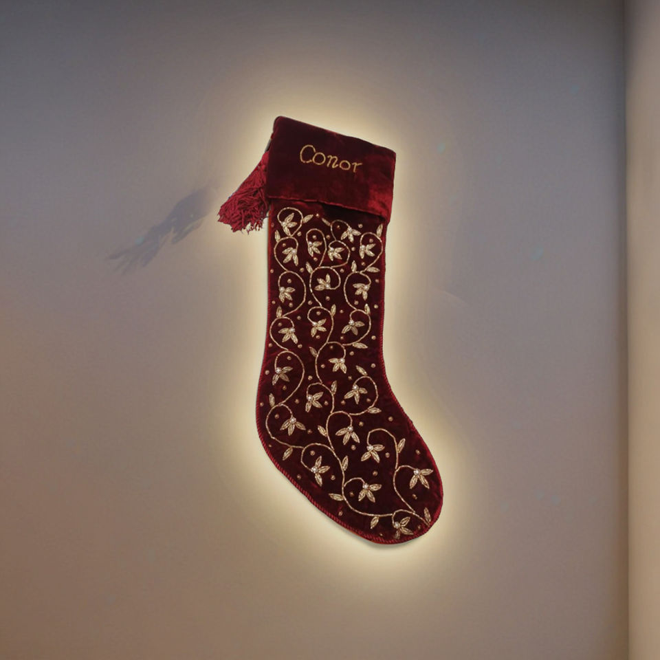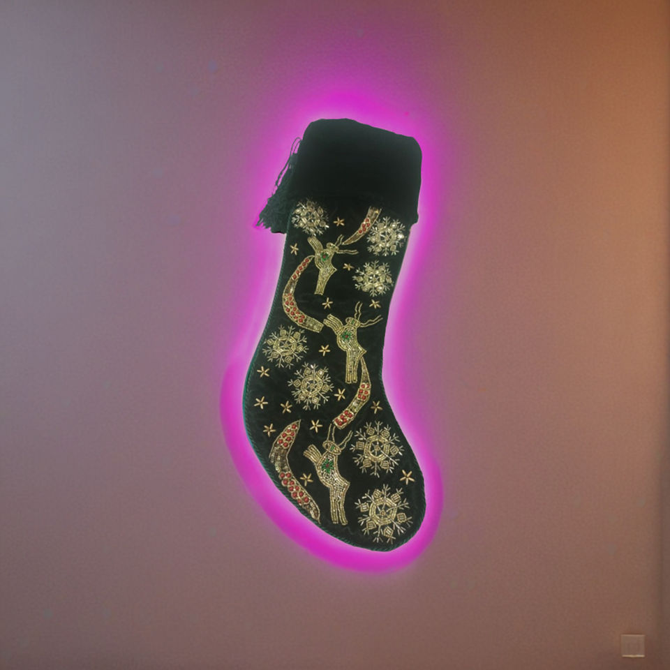 ถุงเท้ากำมะหยี่ปักลายกวางเรนเดียร์และเกล็ดหิมะสำหรับตกแต่งวันหยุดทำในอินเดีย