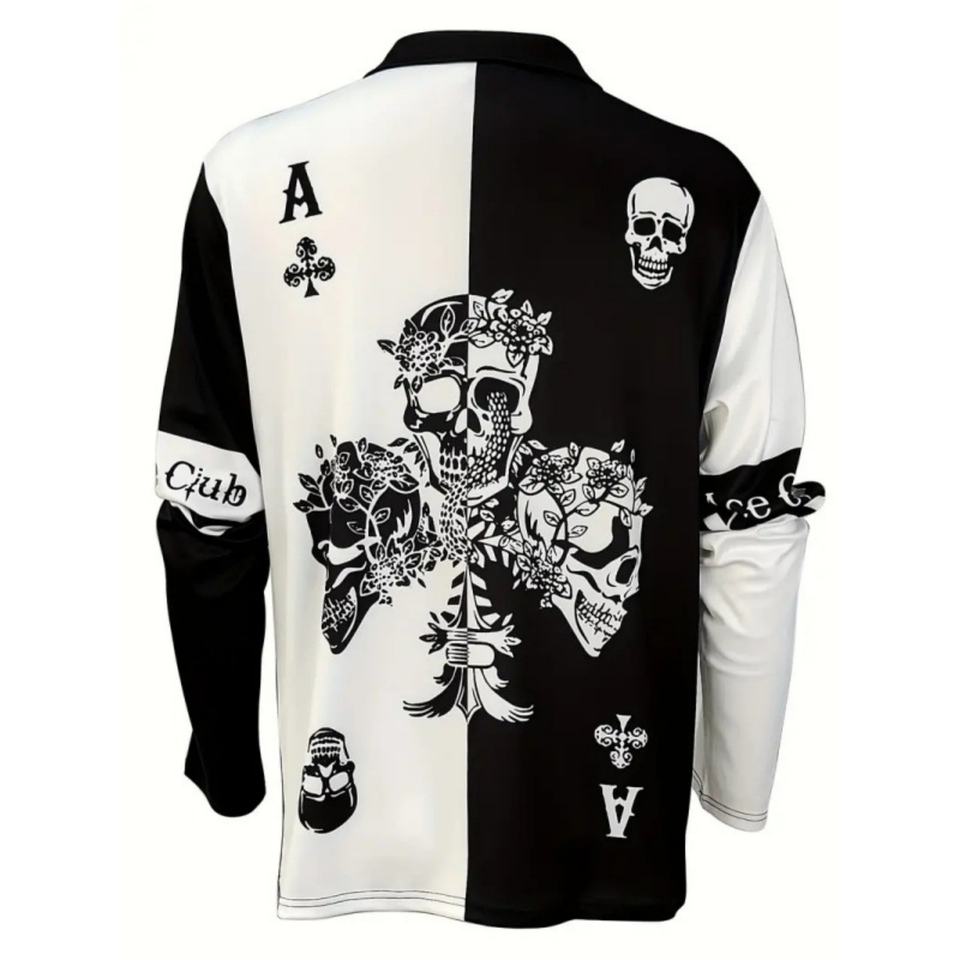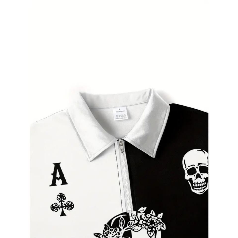 เสื้อโปโลผู้ชายพิมพ์ลายหัวกะโหลก 3 มิติ สีดำขาว ตัดต่อสี ดีไซน์สตรีทแฟชั่น ทรงหลวม ระบายอากาศได้ดี ปกเสื้อแบบมีปก ซิปหน้า